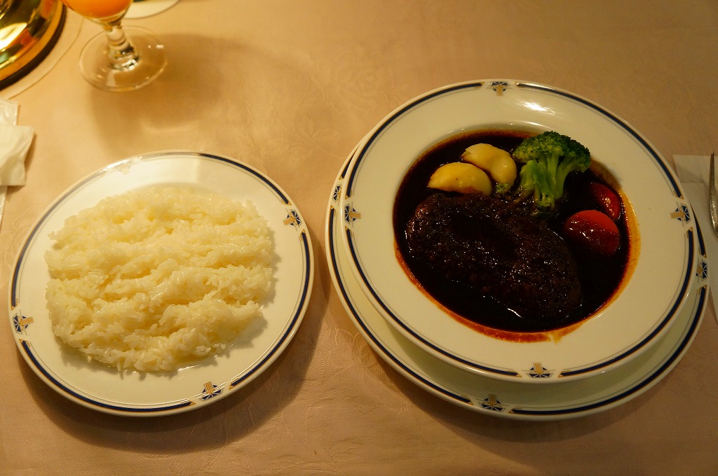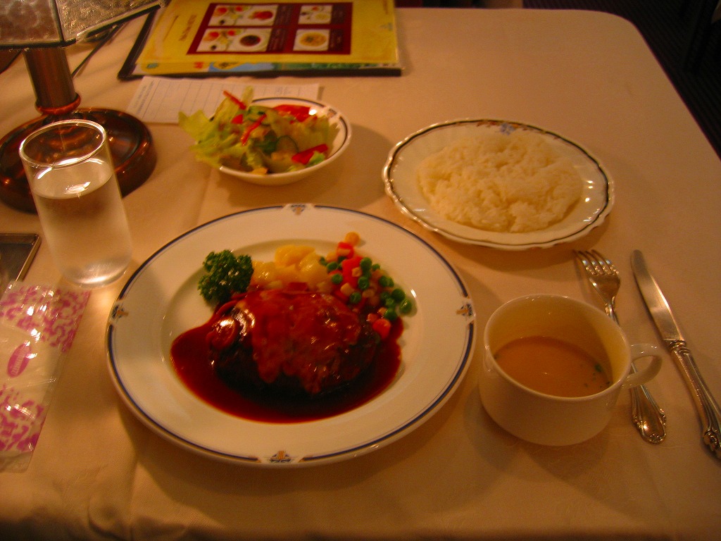 札幌発上野行の寝台特急列車「北斗星」で食べた夕食。予約時間の終了後から23時までは「パブタイム」と称して、無予約注文が可能な営業が実施される。酒類や軽食の他に、こういう食事メニューも食べられた。内容は煮込みハンバーグ、リヨン風サラダ、パン又はライス、コーヒー又は紅茶のセット。どっぷりデミグラスソースに漬かったハンバーグに、具だくさんのサラダ。当日のセットメニューはこの他に「ビーフシチューセット」(2,500円)があり、煮込みハンバーグがビーフシチューに差し替わる。