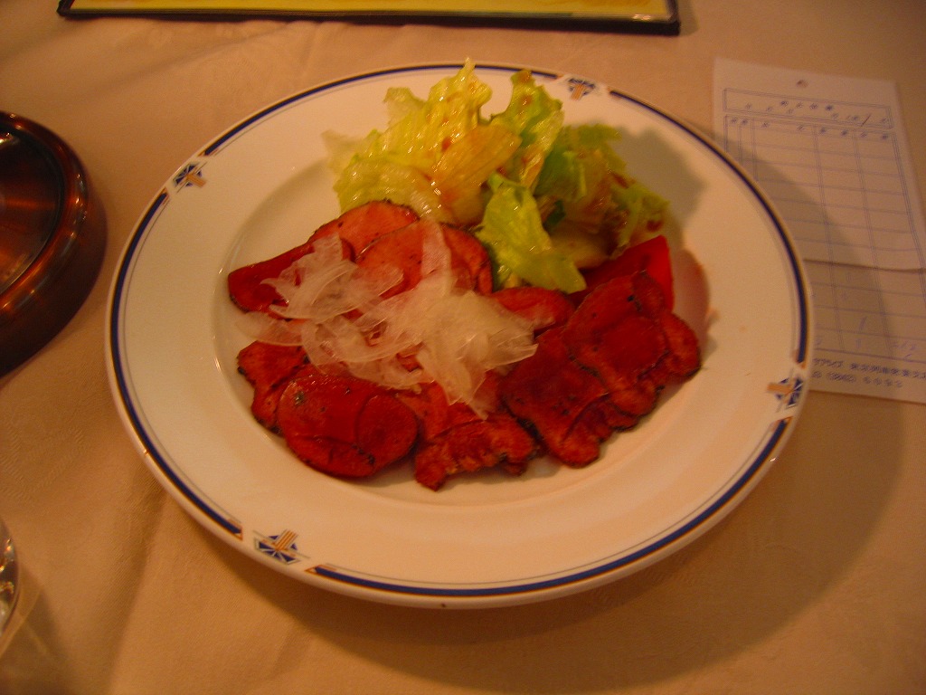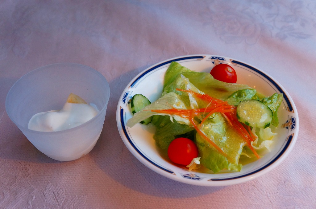 札幌発上野行の寝台特急列車「北斗星」で食べた夕食。名前のとおり、見てのとおり、スパゲティのペペロンチーノ。しっかりアルデンテでしっかり辛い、料理の味は良好。当日のワンプレートメニューはこの他に「ビーフシチュー」(1,600円)、「煮込みハンバーグ」(1,400円)、「リヨン風サラダ」(800円)のセット崩れメニューと、「ビーフカレー」(1,200円)、「きのことベーコンの和風パスタ」(1,200円)、「ピッツァ・マルゲリータ」(800円)があった。
