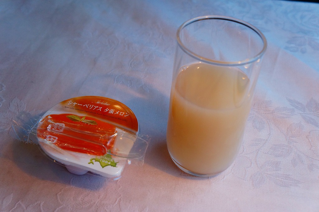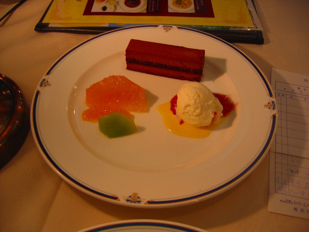 上野発札幌行の寝台特急列車「北斗星3号」で食べたデザート。内容は小さなチョコケーキ、バニラアイス、キウイ、オレンジ。見た目も風味も寂しいが、こういうものは昼間のティータイムに提供するメニュー。夕食と朝食の営業しかしない食堂車に備わっていること自体に、感謝すべきか、違和感を覚えるべき。