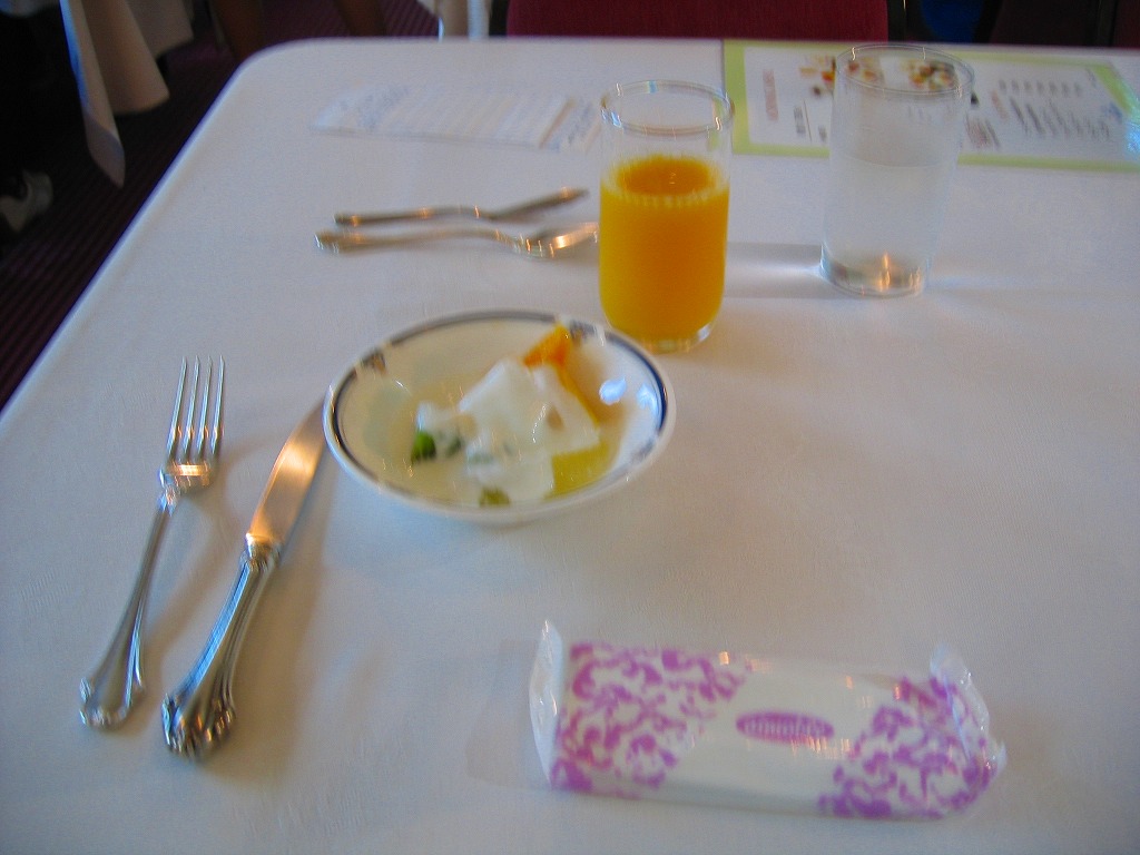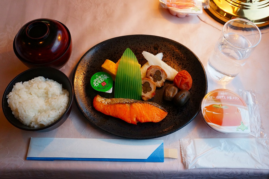 札幌発上野行の寝台特急列車「北斗星」で食べた朝食。ご飯、味噌汁、焼き魚、卵焼き、かまぼこ、わさび漬け、香の物など、デザート、コーヒー又は紅茶のセット。内容の割にとても高価だとは思ったが、日本国内で食堂車を利用することそのものが、とても貴重な体験。また、いまや宿泊施設の朝食はバイキング形式の食べ放題が普通なので、こうやって一食分が出てくることが新鮮に思えた。