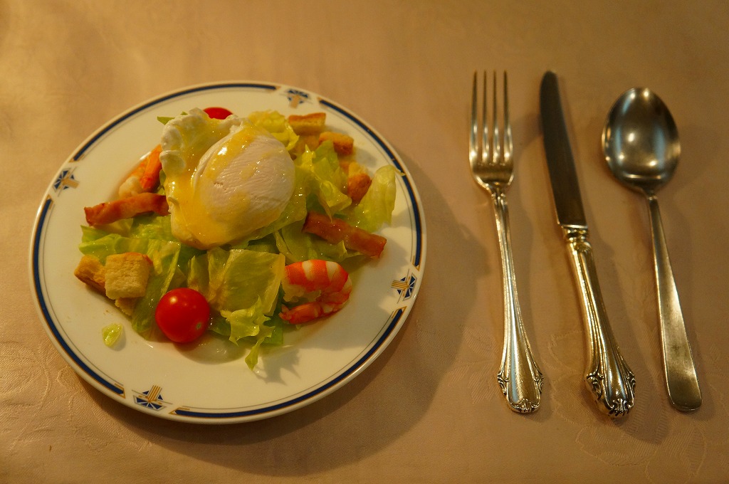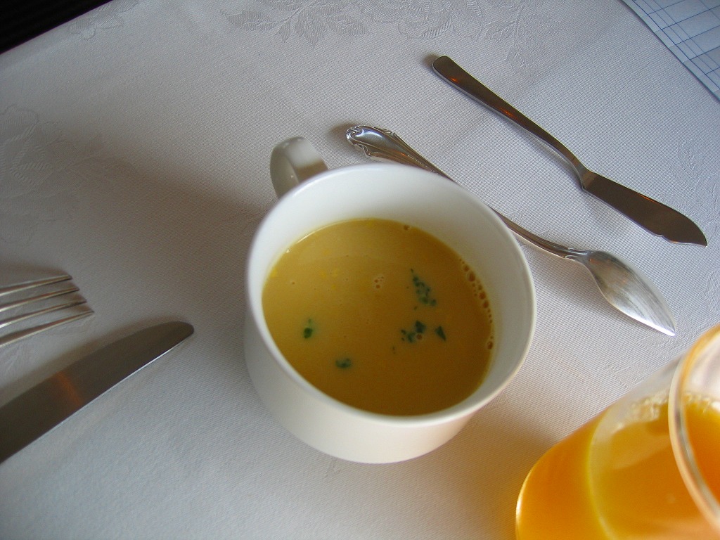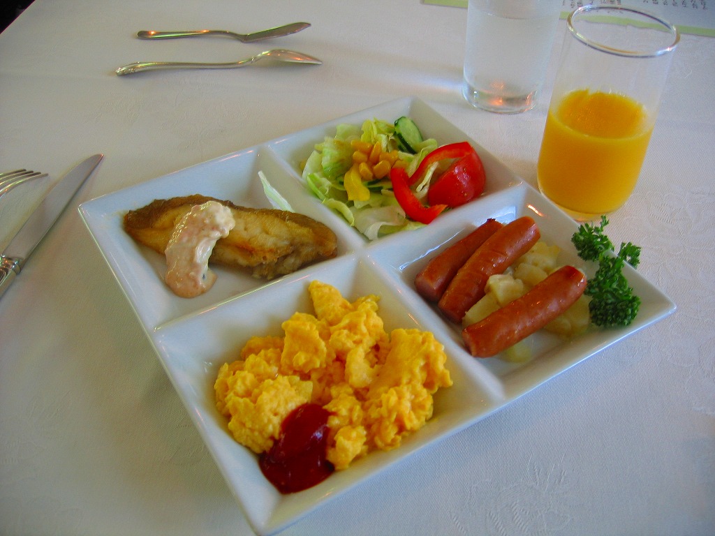 上野発札幌行の寝台特急列車「北斗星3号」で食べた朝食。白身魚フライ、卵とじ、生野菜サラダ、ポテトとソーセージが載るメインのプレートに、フルーツ、コーンスープ、パン、ジュース、コーヒー、冷水を付けるもの。分量や風味や見栄えと価格は、シティホテルのものと大差ないだろう。大沼や駒ヶ岳に噴火湾を車窓に眺めながら、絶対に非日常的なブレックファースト。