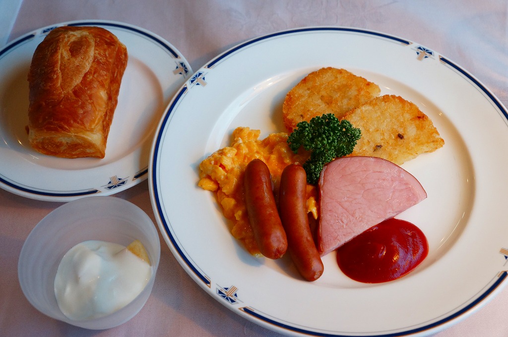札幌発上野行の寝台特急列車「北斗星」で食べた朝食。パン、ミニサラダ、ロースハム、ソーセージ、ハッシュドポテト、スクランブルエッグ、オレンジ又はリンゴのジュース、フルーツのヨーグルトがけ、デザート、コーヒー又は紅茶のセット。下記の6年半前と違い、和朝食と洋朝食は完全に別のメニューになっていた。これ以外の食事の提供はなかった。禿げた真冬の田んぼを車窓に眺めながら、人生最後の北斗星を味わった。