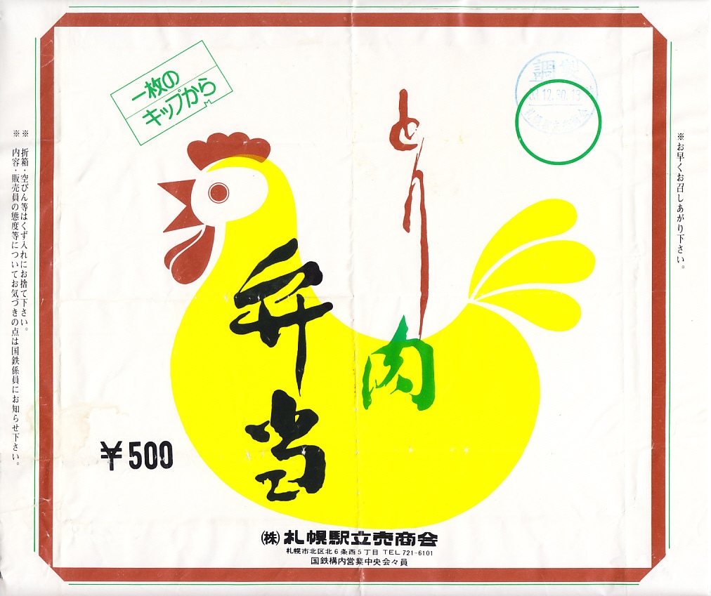 1978(昭和53)年12月30日13時の調製と思われる、昔の札幌駅弁の掛紙。ニワトリの絵柄を大きく使う、わかりやすいデザイン。「一枚のキップから」は、当時の国鉄の観光キャンペーン。