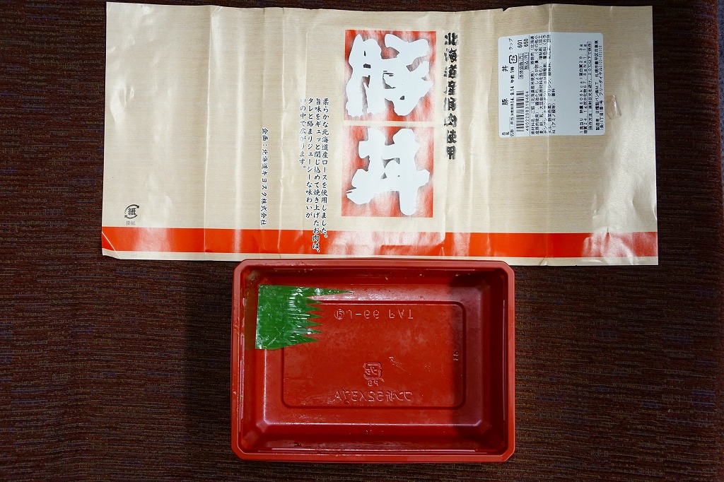 2014(平成26)年9月に旭川駅のキヨスクで買えたお弁当。同じものが札幌駅のキヨスクにもあった。長方形のプラ容器に白飯を詰めて豚焼肉で覆い、紅生姜を添えて商品名の掛紙を巻いたもの。肉もタレも本当にクセのない味は、スマートなお惣菜。