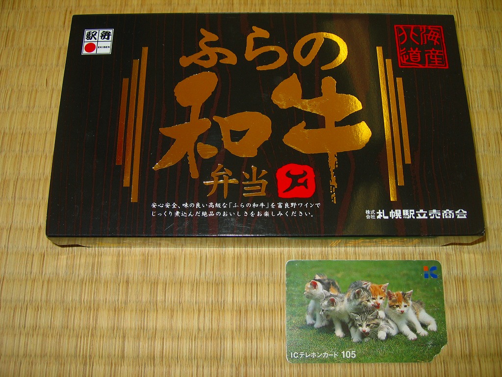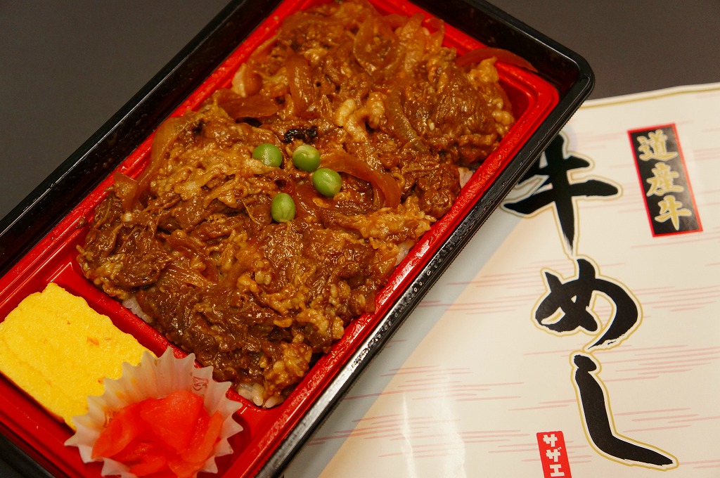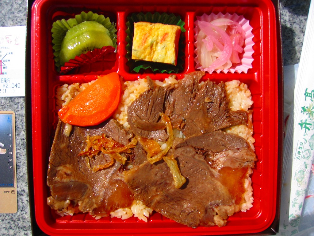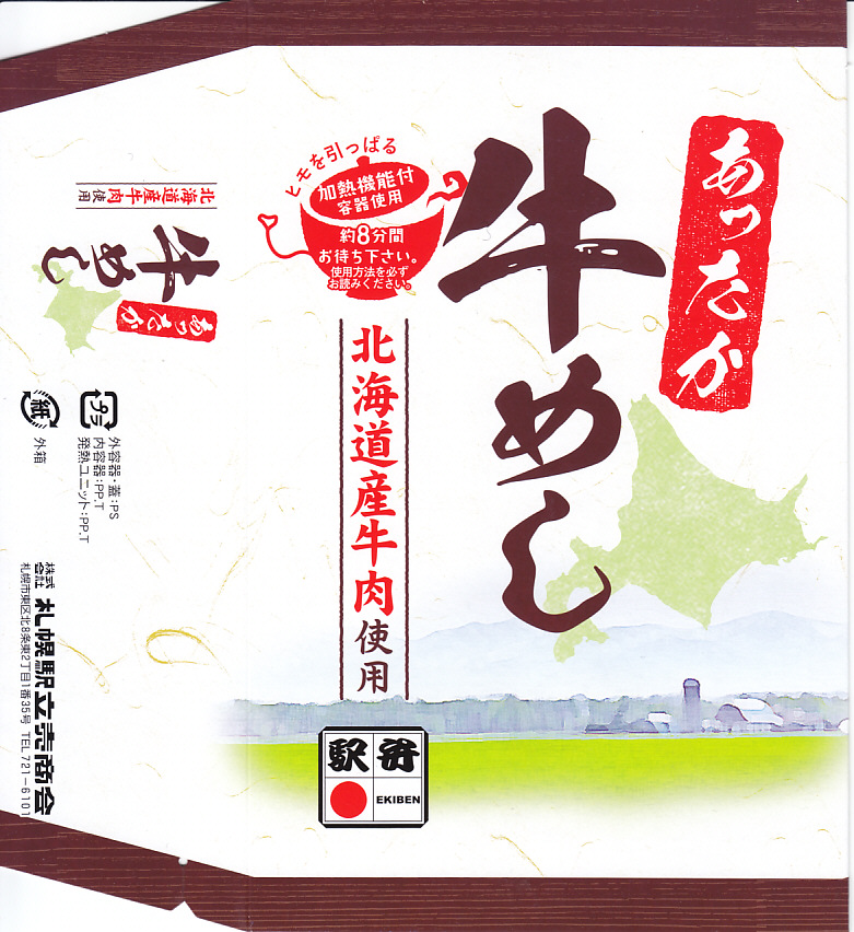 2003(平成15)年5月に発売。前年10月に旅情報誌「じゃらん」北海道版で特集された9〜12月発売「短角牛弁当」のレギュラー入りらしい。赤いトレーを正方形のボール紙容器に収める。中身は北海道米ほしのゆめの御飯に、札幌産のタマネギと宗谷産の黒牛肉を載せ、日高産の昆布入り玉子焼など。パッケージの食べられてしまう牛が喜ぶイラストは、豚や鶏ではよく見るが牛では珍しいと思う。価格の「特別定価」とは何だろう。2013年時点で販売されていない。