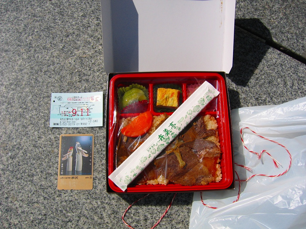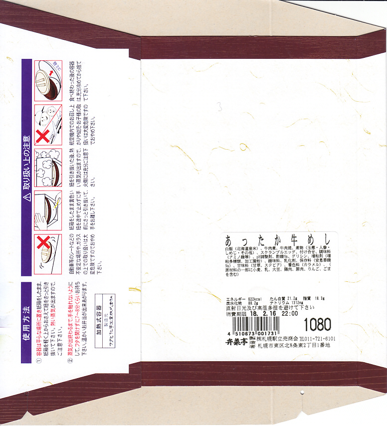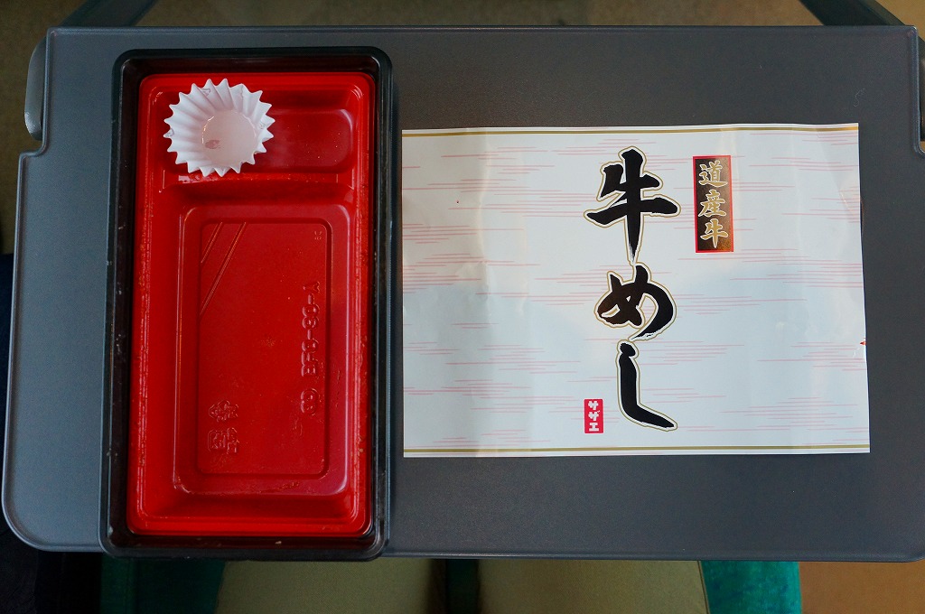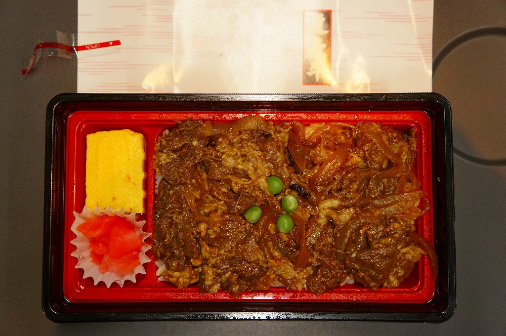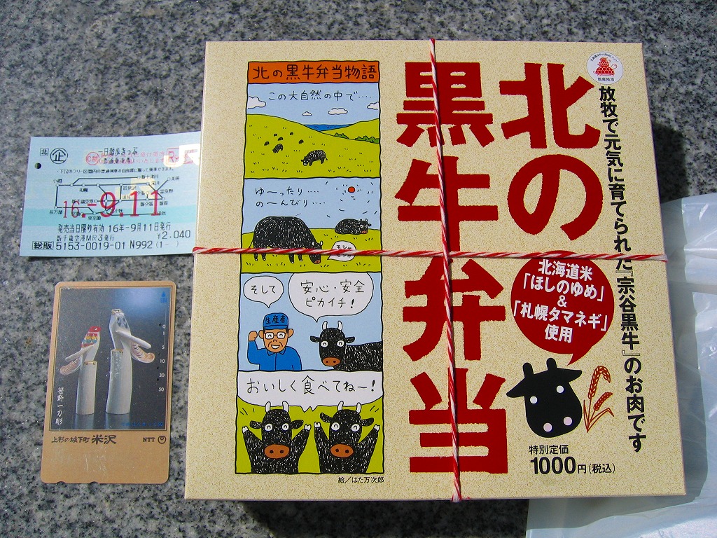 2003(平成15)年5月に発売。前年10月に旅情報誌「じゃらん」北海道版で特集された9〜12月発売「短角牛弁当」のレギュラー入りらしい。赤いトレーを正方形のボール紙容器に収める。中身は北海道米ほしのゆめの御飯に、札幌産のタマネギと宗谷産の黒牛肉を載せ、日高産の昆布入り玉子焼など。パッケージの食べられてしまう牛が喜ぶイラストは、豚や鶏ではよく見るが牛では珍しいと思う。価格の「特別定価」とは何だろう。2013年時点で販売されていない。