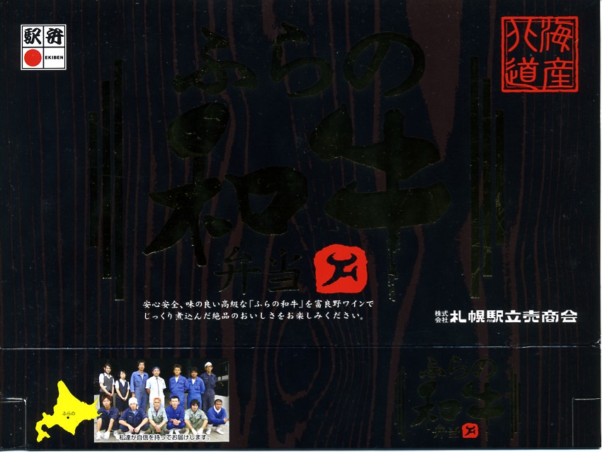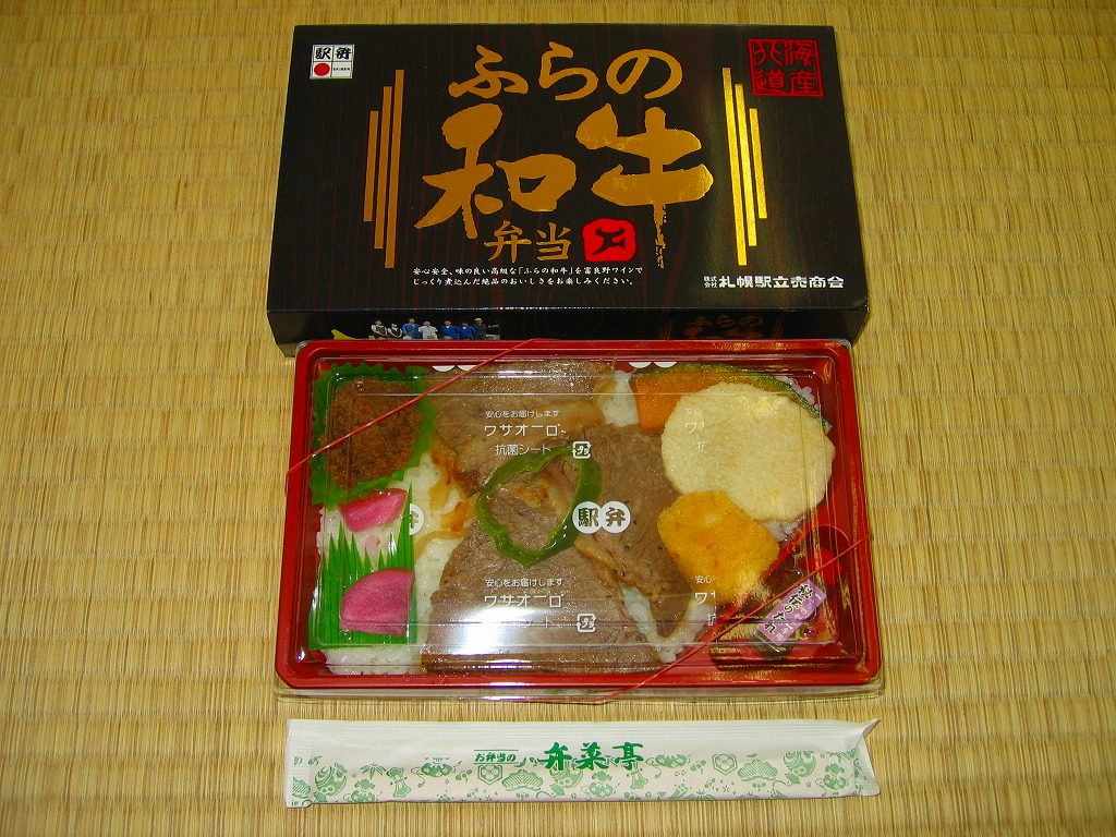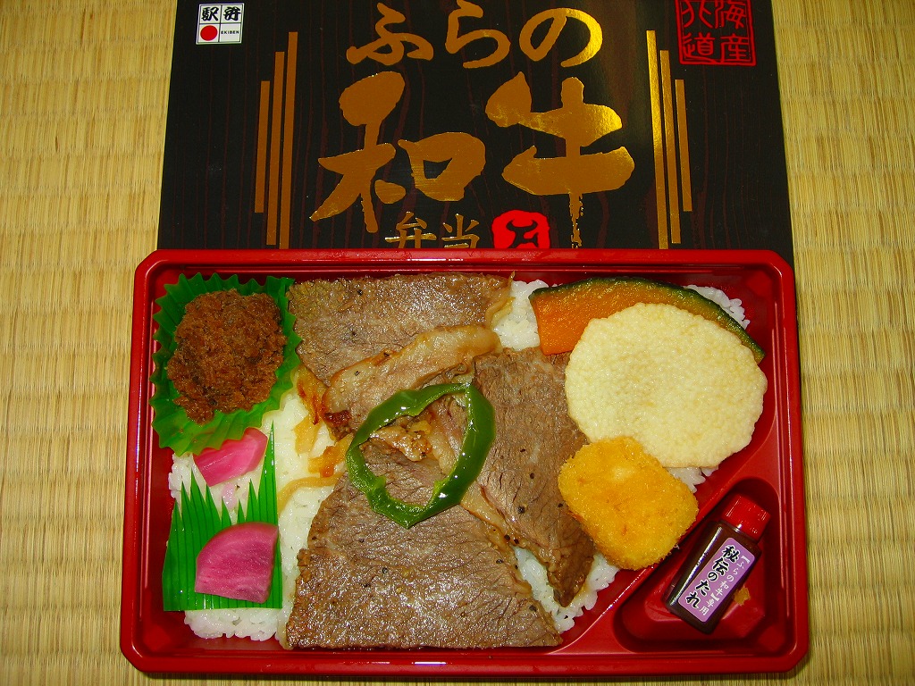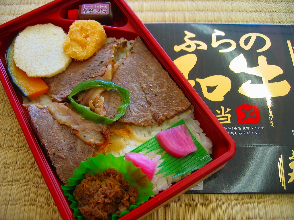 2008(平成20)年10月の発売は、2008〜2009年の駅弁大会シーズンに向けたものだろうか。トレーを接着した長方形の容器に透明なふたをして、家具のような木目柄に金色で駅弁の名前を描くボール紙の枠にはめる。中身は北海道米ななつぼしの白御飯の上に、富良野ワインで煮た「ふらの和牛」もも肉を置き、カマンベールチーズフライやカボチャにナガイモ揚やピーマンを貼り、牛肉しぐれ煮と赤カブとタレを添えるもの。