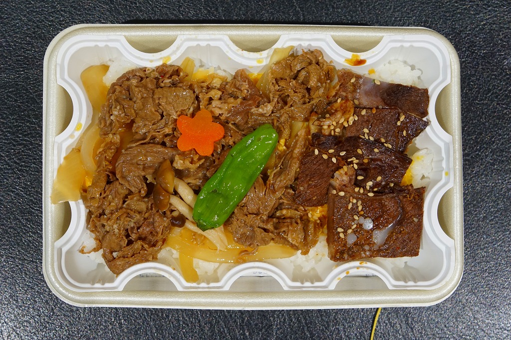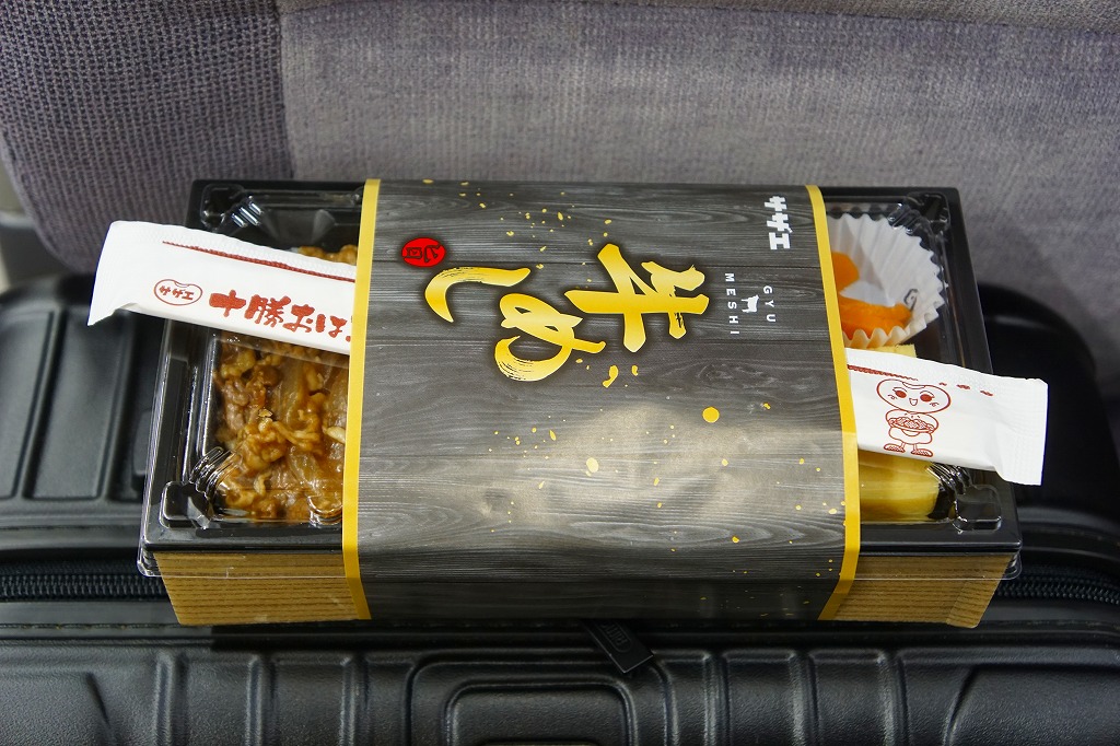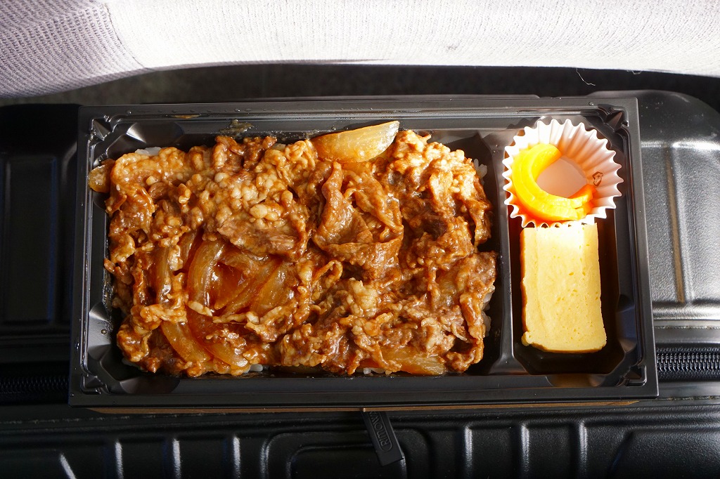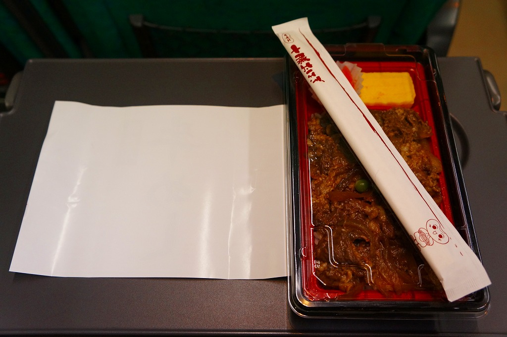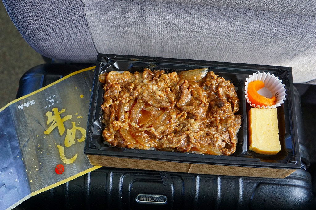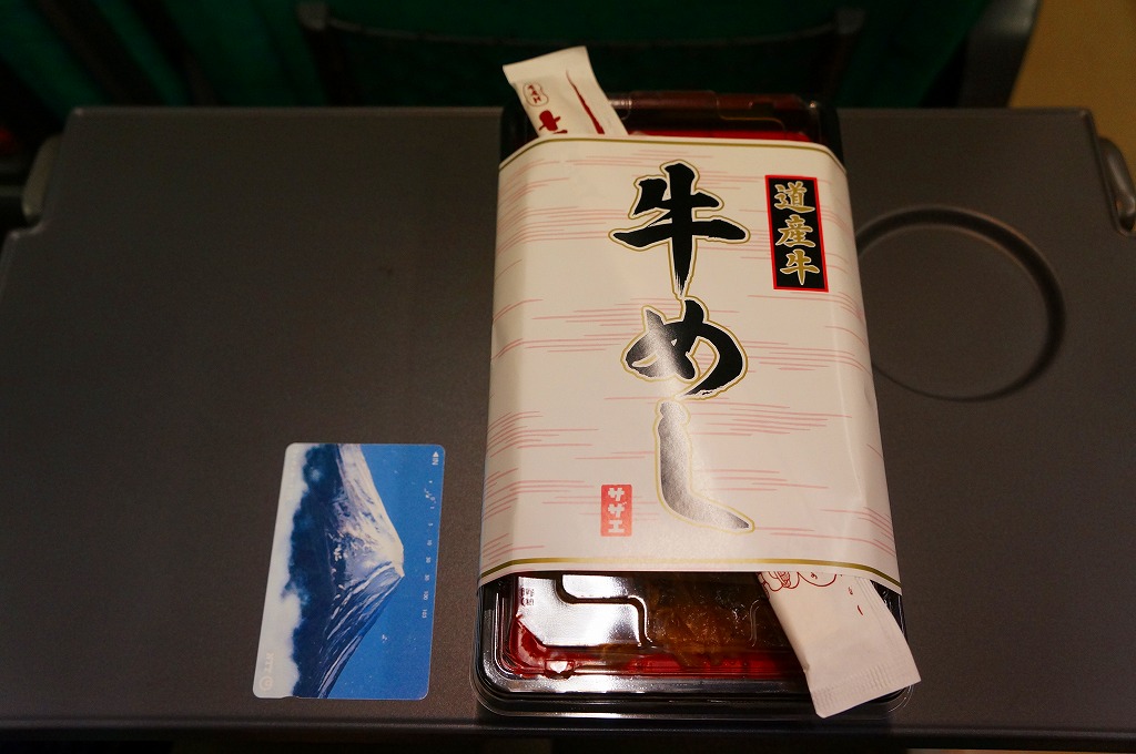 札幌駅の駅弁売店でなくキヨスクで買えた、駅弁のようなお弁当。白御飯を牛焼肉とタマネギ炒めで覆い、グリーンピースで彩り、玉子焼と大根漬を添える。コンビニ弁当や惣菜弁当のたぐいだろうが、見栄えも中身も駅弁の王道を行く。冷蔵の味もそんなに悪くない。これで575円だから、駅弁と考えれば格安。
