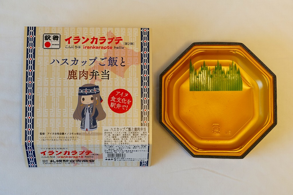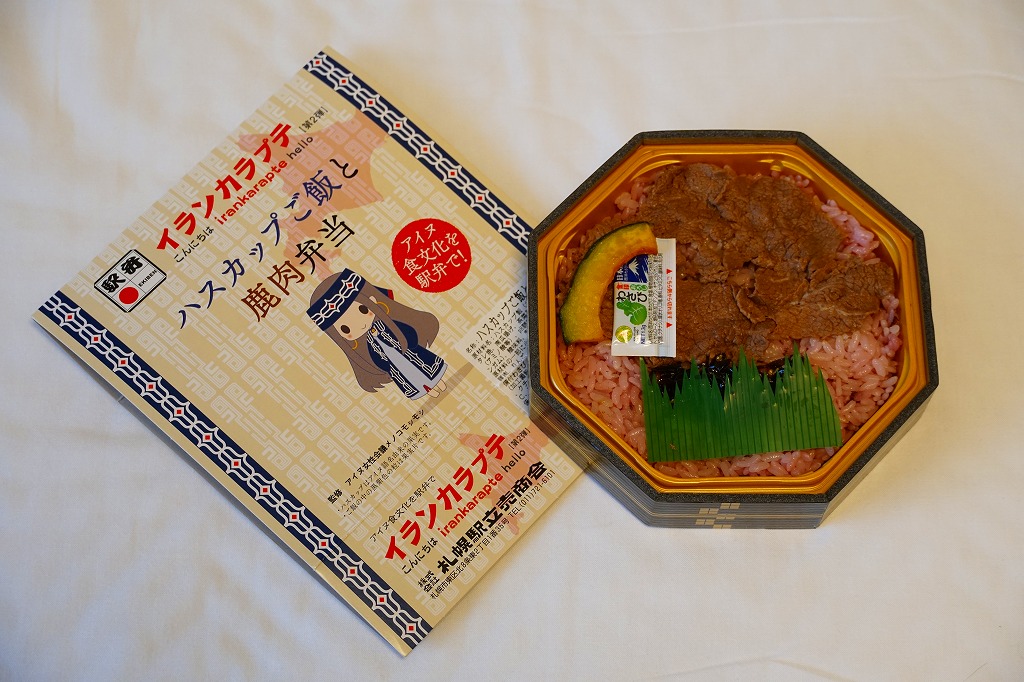 北海道命名150年事業応援企画として2018(平成30)年4月10日に発売したものに次ぐ、札幌駅のイランカラプテ駅弁の第2弾として、2018(平成30)年9月20日に発売。「イランカラプテ」とは、アイヌ語で「こんにちは」の意味。今回は「ハスカップご飯と鹿肉弁当」の副題が付き、その名のとおりハスカップの実で染めた御飯を、鹿肉のタレ焼で覆い、昆布とカボチャを添えていた。そんな内容はアイヌ料理に由来するという。今回は大阪の駅弁催事での輸送販売だったためか、味がないうえに硬くなっており、おそらく本来の味をいただけなかったと思う。