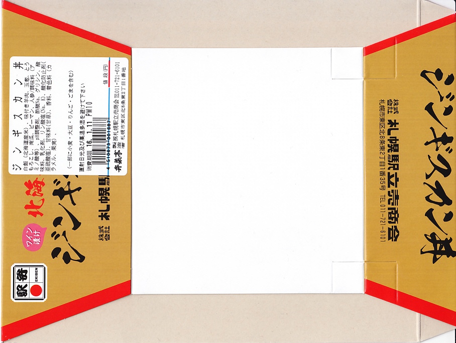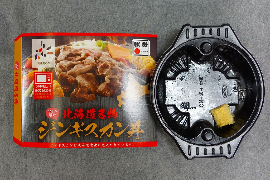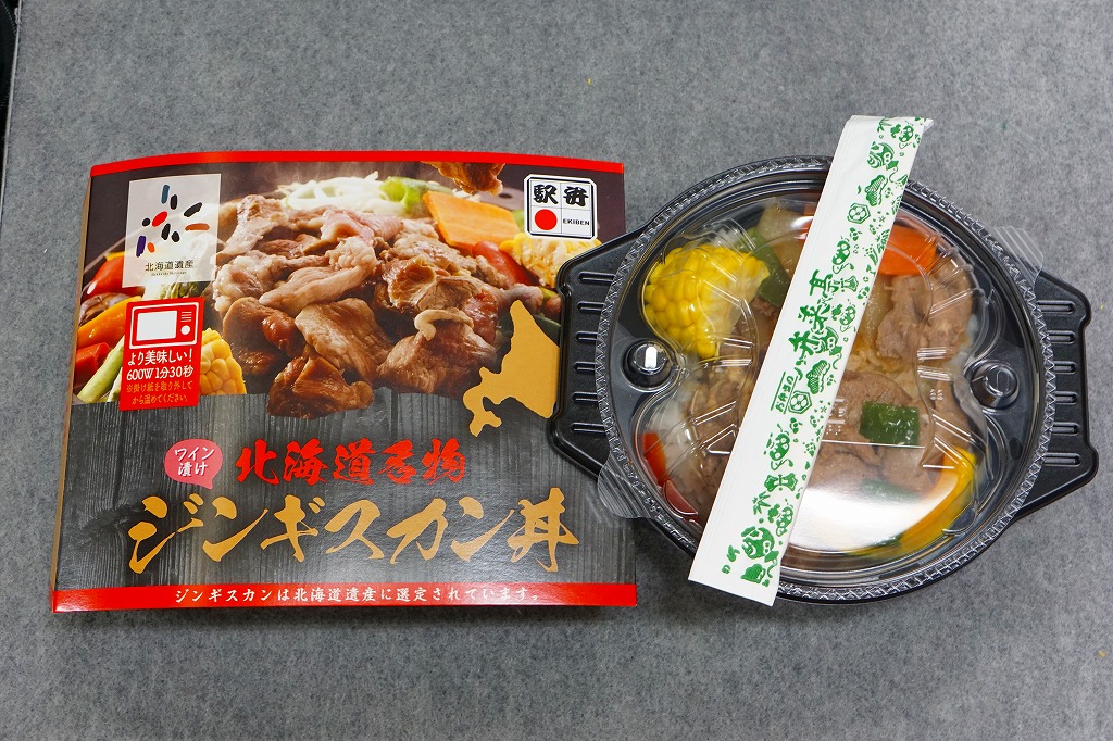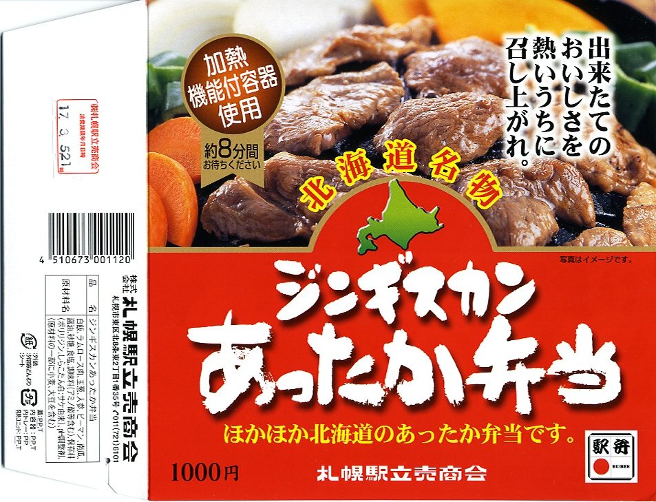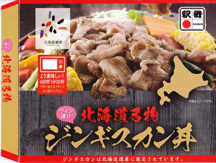 1997(平成9)年に発売。円形の加熱機能付き容器を、中身の写真を美しく載せたボール紙のパッケージに入れる。中身は白御飯の上にラムロース肉を敷いてタマネギ・ニンジン・ピーマン・カボチャを置く。駅弁なので出来立てではないのに、ラム肉に臭みも固さもないなど、札幌のビール園で観光名物となるジンギスカンの風味がよく再現されていると思う。価格は2005年の購入時で1,000円、2013年時点で850円、2016年時点で再び1,000円、2022年時点で1,100円。冬季限定発売と思われる。