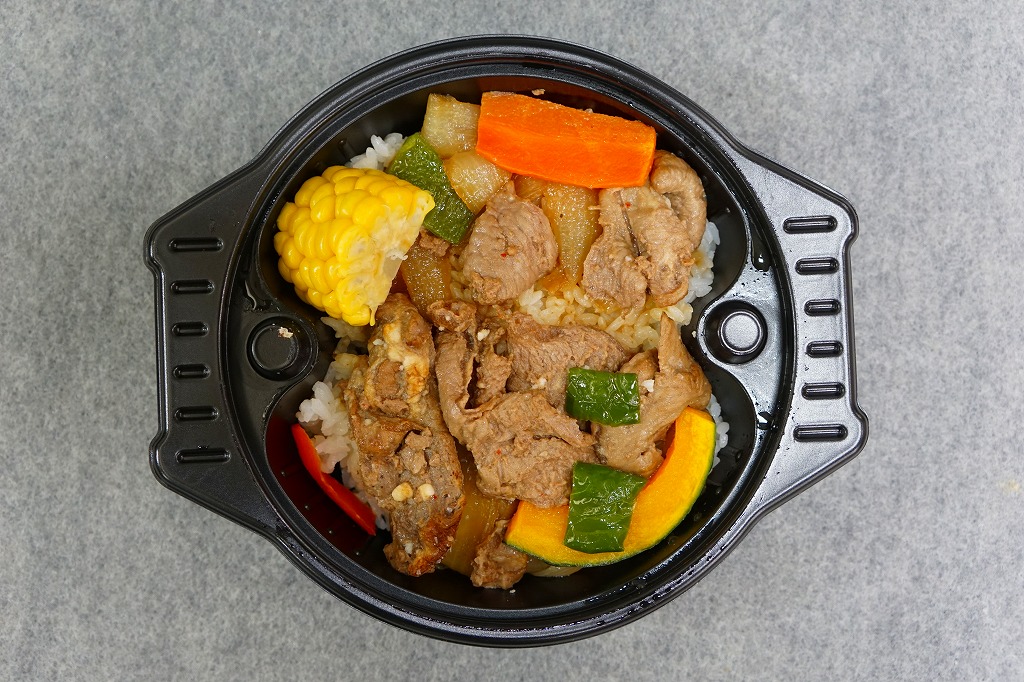 2015(平成27)年10月1日の発売だそうな。下記の駅弁「ジンギスカンあったか弁当」の、加熱機能付き容器を使わないバージョン。ということで中身もほぼ同じで、白御飯を味付き羊肉で覆い、タマネギ、トウモロコシ、カボチャ、ピーマン、ニンジンで彩る。常温なので羊肉はかなり固くなるが、味付けを含め、食べられないほどでもない。電子レンジ対応の黒いプラ製容器の形状は、北海道のジンギスカン屋で使われる鉄鍋のそれを思わせる。