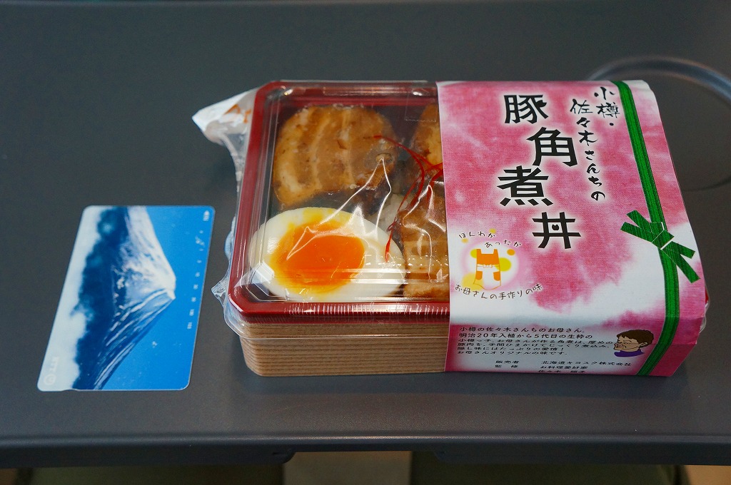 2012(平成24)年の発売か。札幌駅ほか道内各地の駅弁売店でなくキヨスクで売られる、駅弁のようなお弁当。白御飯を豚角煮3個、半身のゆで卵、カボチャ、れんこん、昆布佃煮、きんぴらごぼう、大根漬で覆う。まるで空弁のようにコンパクトかつ無臭で、豚角煮なのにスマートで控えめなお味。掛紙によると、1887(明治20)年入植から5代目の小樽っ子である、佐々木さんちのお母さんが作る角煮なのだそうだ。2015年頃までの販売か。