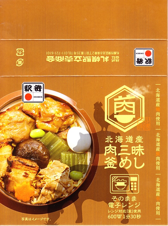 2021(令和3)年9月に札幌駅で発売。商品名と中身の写真を描いたスリーブに収める、各地の釜飯駅弁でも使われるプラ製の釜型容器に、茶飯を詰め、道産鶏照焼、道産豚角煮の炙り焼き、道産牛肩ロース煮、しいたけ、にんじん、うずら卵、ふきなどで覆う。肉三昧ほどの分量がなくても、牛豚鶏でちゃんと3種類のお肉を使う、釜飯タイプの駅弁。それらの肉が大粒なので、このサイズを超えて豪快な印象を受けた。