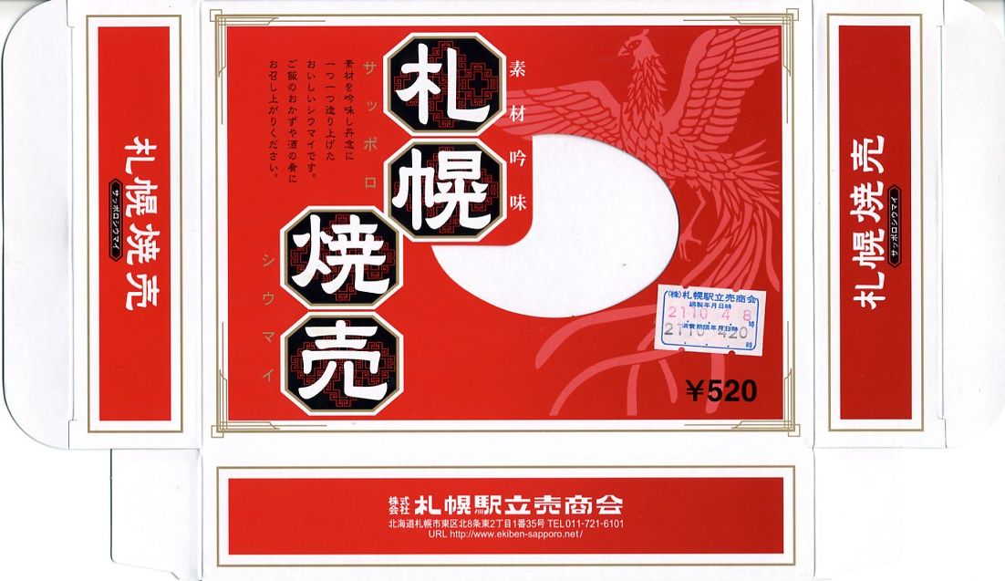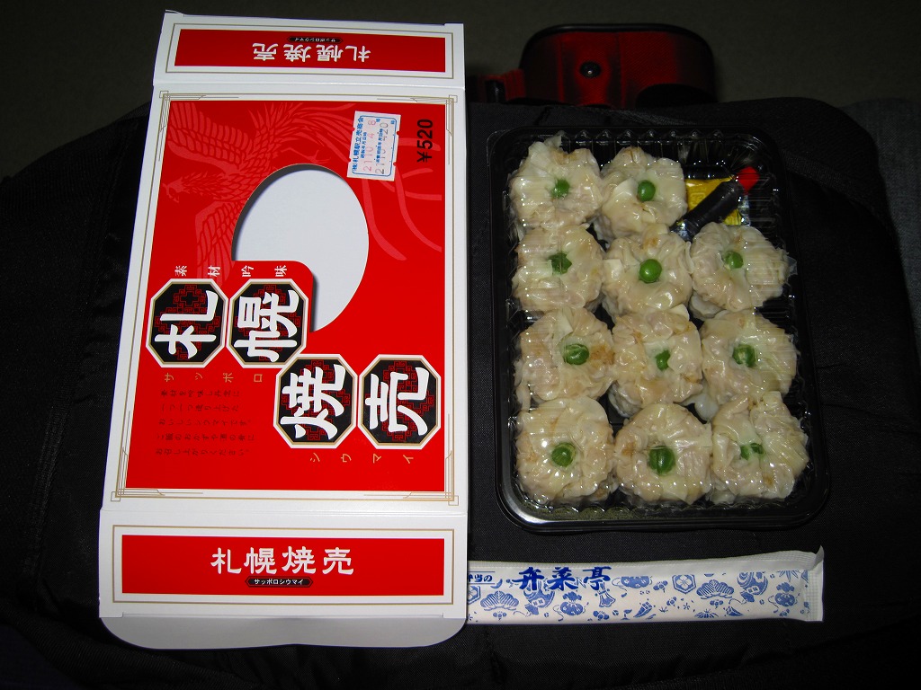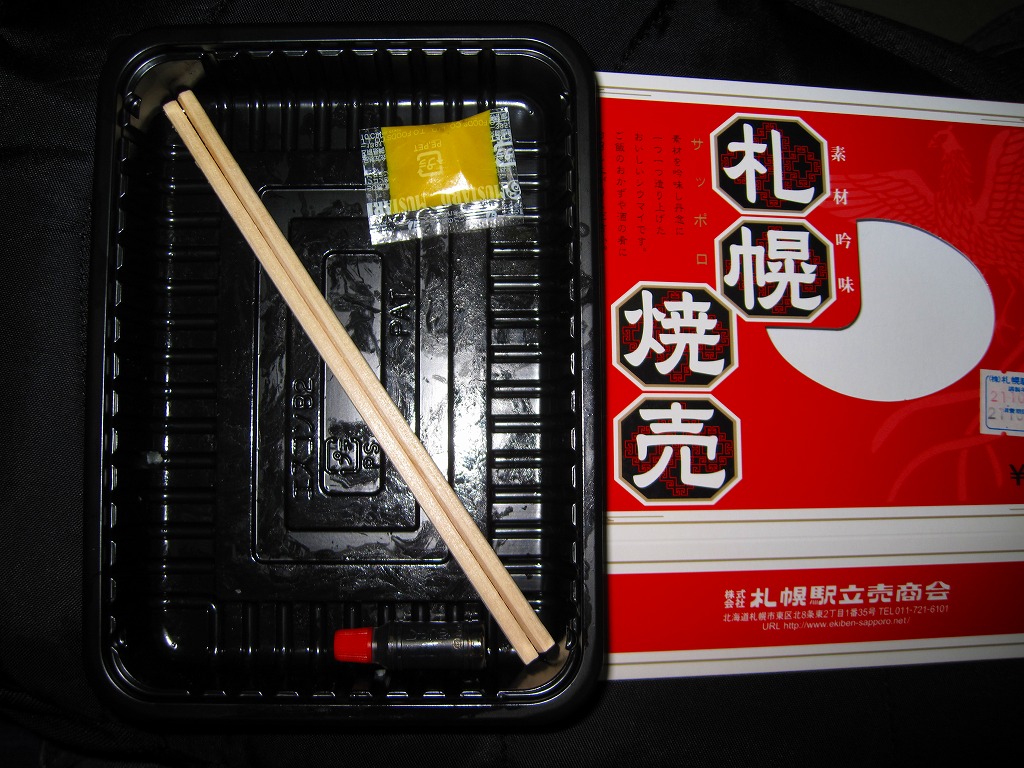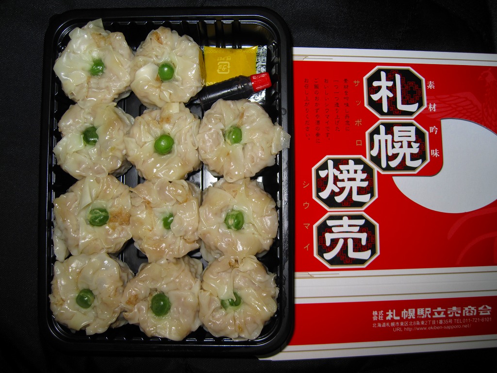 札幌駅に昔からいたのではないかと思う駅売り焼売。楊枝ではなく割りばしを入れた赤いボール紙の箱に、プラ製の惣菜容器に敷き並べた11個の焼売が収まる。横浜駅や鳥栖駅のものとは違い、博多駅のものに似ている、スーパーでのチルド商品と同じように柔らかい、しかし常温でも食べて大丈夫な普通の焼売。残念ながら、2014年時点で終売とされる。