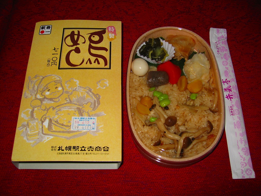 容器に高級感と安物感が見栄えで同居するが、中身で北海道を演出し、白御飯を遠慮なく詰めて分量もそこそこ。食べて良かったと思える駅弁。名前から旭川駅の駅弁かと思ったら、札幌駅弁だった。札幌から富良野までは臨時特急で2時間弱、高速バスで2時間半強、旭川から富良野までは普通列車で1時間強。この駅弁は2012年までの販売か。