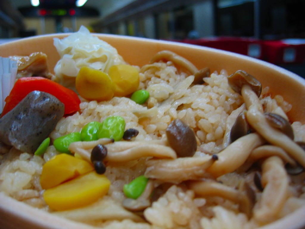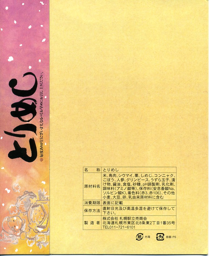 札幌駅伝統の駅弁で、魚介類を使用した駅弁が幅を利かせる北海道内では珍しい、肉類が主役の駅弁。楕円形の容器に透明なふたをして、ボール紙の枠に詰めて箸袋を差し込む。中身は鶏飯にしめじ、栗、焼売、こんにゃく、うずらの卵、人参、鶏肉など。