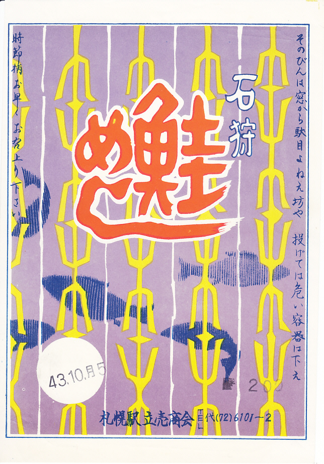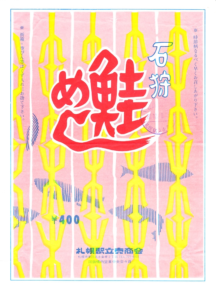 1985(昭和60)年10月9日の調製と思われる、昔の札幌駅弁の掛紙。絵柄は下記の1968年のものから変わらない。文字が活字になり、注意書きは普通の表現になった。泳ぐ鮭以外の絵柄には、どんな意味があったのだろうか。