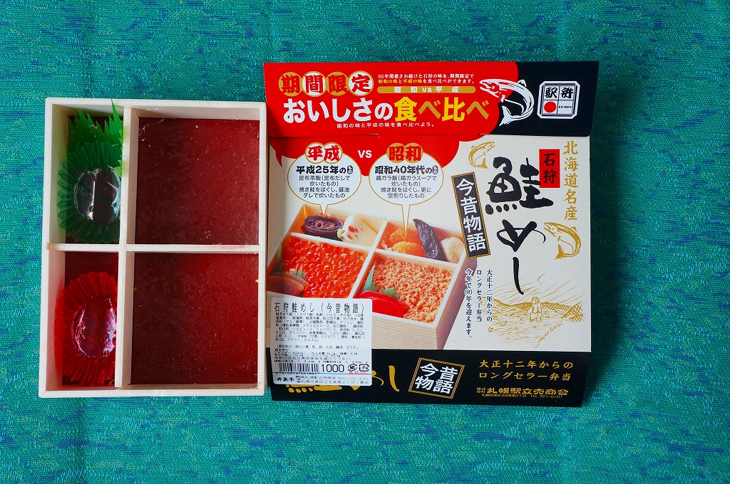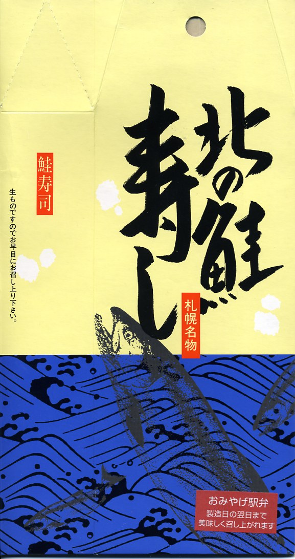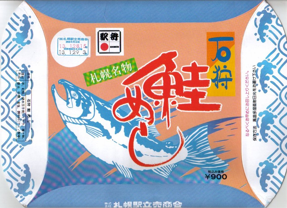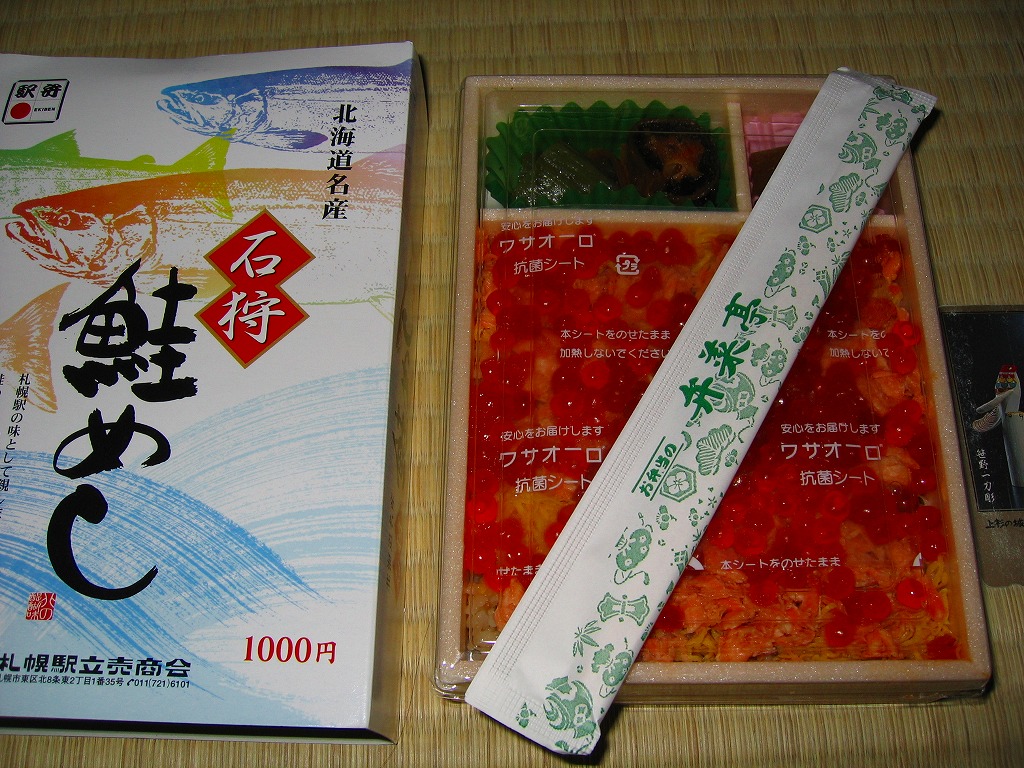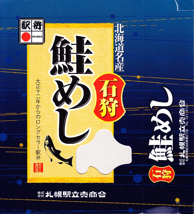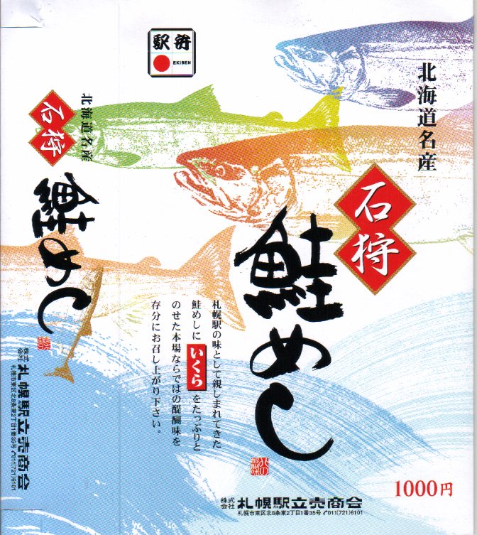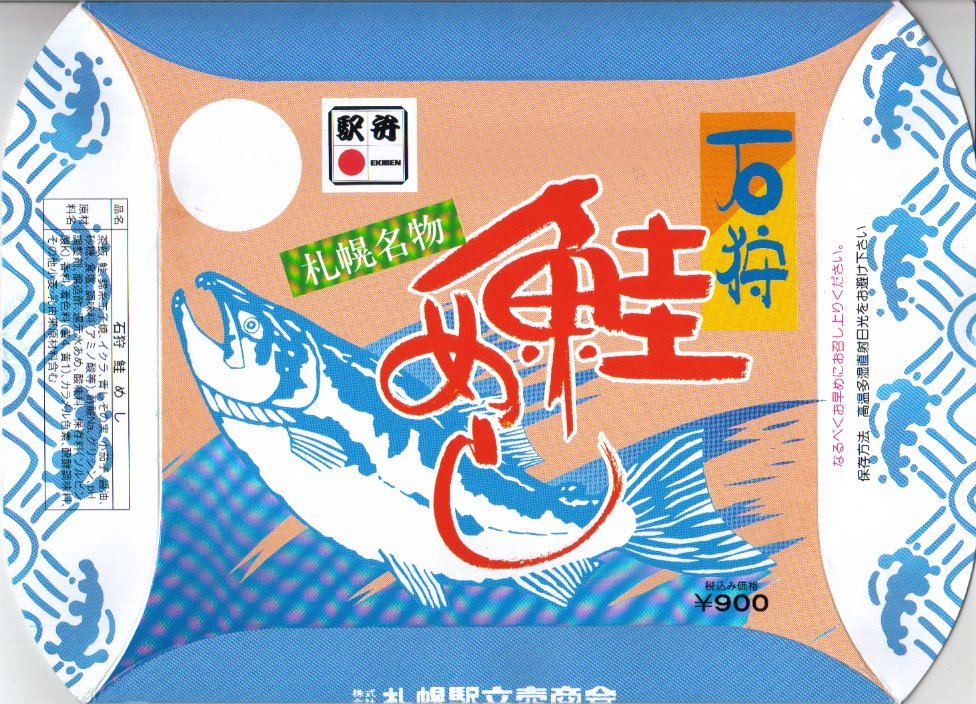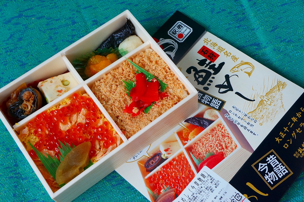 1923(大正12)年に札幌駅で発売されたロングセラー。幕の内弁当でも助六寿司でもない駅弁「特殊弁当」では、北海道で初めてのものだという。2014年までには使われるようになったこの青いスリーブには発売年を記し、商品名を記して中身を少しだけ見せる。中身は昆布飯を鮭そぼろとイクラ醤油漬で覆い、奈良漬、鮭昆布巻、鮭蒲鉾、ふき煮を添えるもの。鮭以外の内容はよく変わるようで、茶飯や鮭飯だったり、イクラを散らしたり固めたり、錦糸卵や枝豆を載せたり、鮭でない付合せだったりするらしい。価格は2004年時点で1,000円、2014年4月の消費税率改定で1,030円、2019年時点で1,150円、2023年時点で1,250円、2024年時点で1,300円、11月から1,350円。