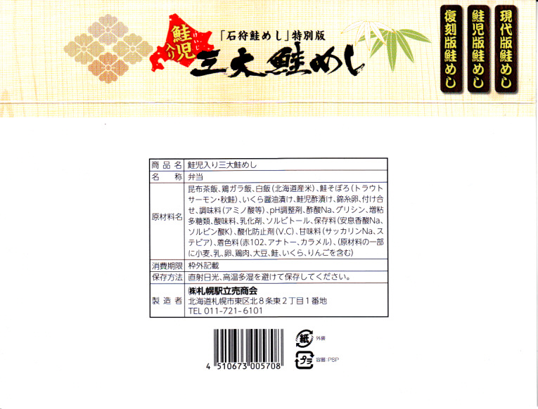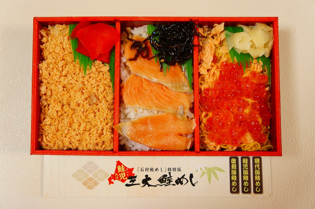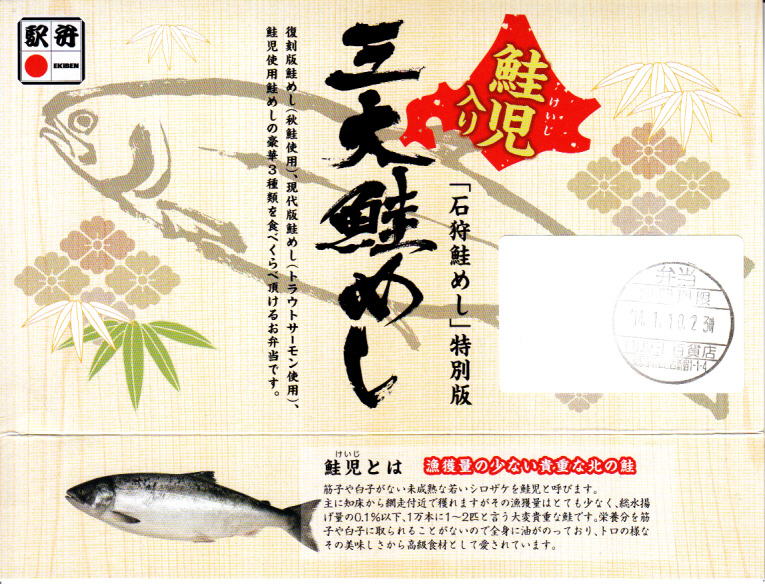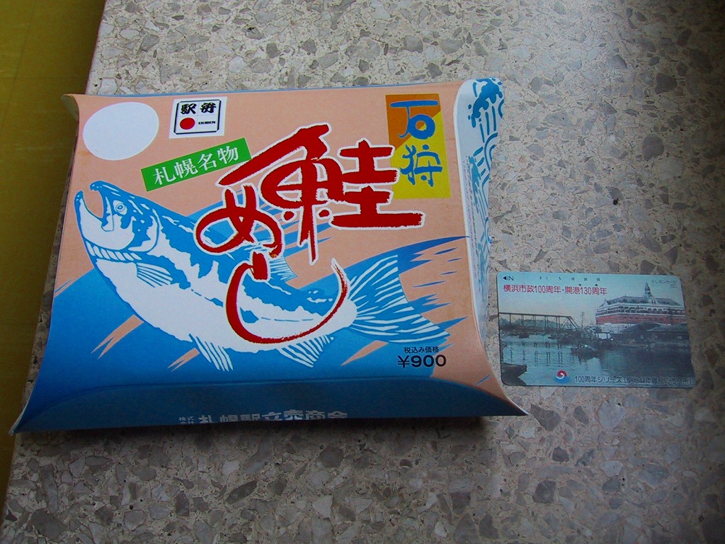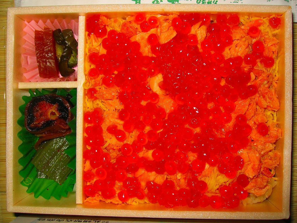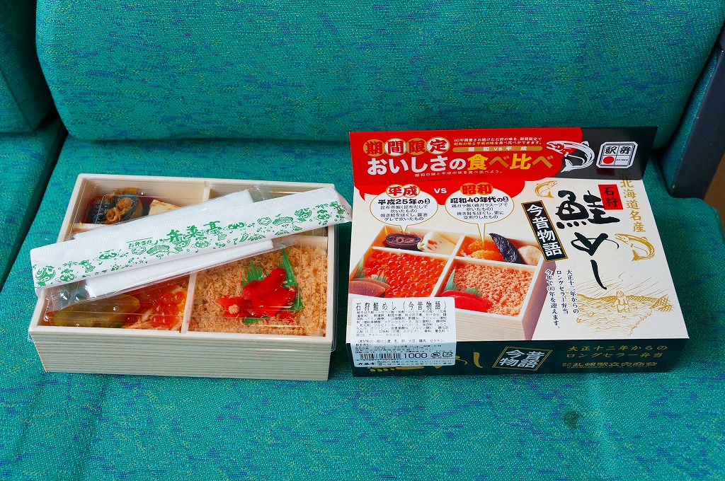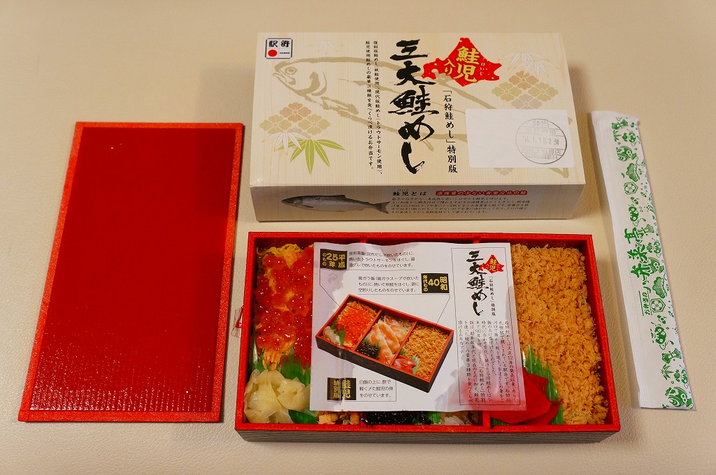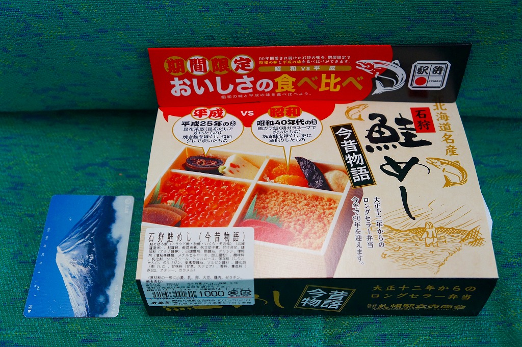 1923(大正12)年に札幌駅で発売されたロングセラー。幕の内弁当でも助六寿司でもない駅弁「特殊弁当」では、北海道で初めてのものだという。2014年までには使われるようになったこの青いスリーブには発売年を記し、商品名を記して中身を少しだけ見せる。中身は昆布飯を鮭そぼろとイクラ醤油漬で覆い、奈良漬、鮭昆布巻、鮭蒲鉾、ふき煮を添えるもの。鮭以外の内容はよく変わるようで、茶飯や鮭飯だったり、イクラを散らしたり固めたり、錦糸卵や枝豆を載せたり、鮭でない付合せだったりするらしい。価格は2004年時点で1,000円、2014年4月の消費税率改定で1,030円、2019年時点で1,150円、2023年時点で1,250円、2024年時点で1,300円、11月から1,350円。