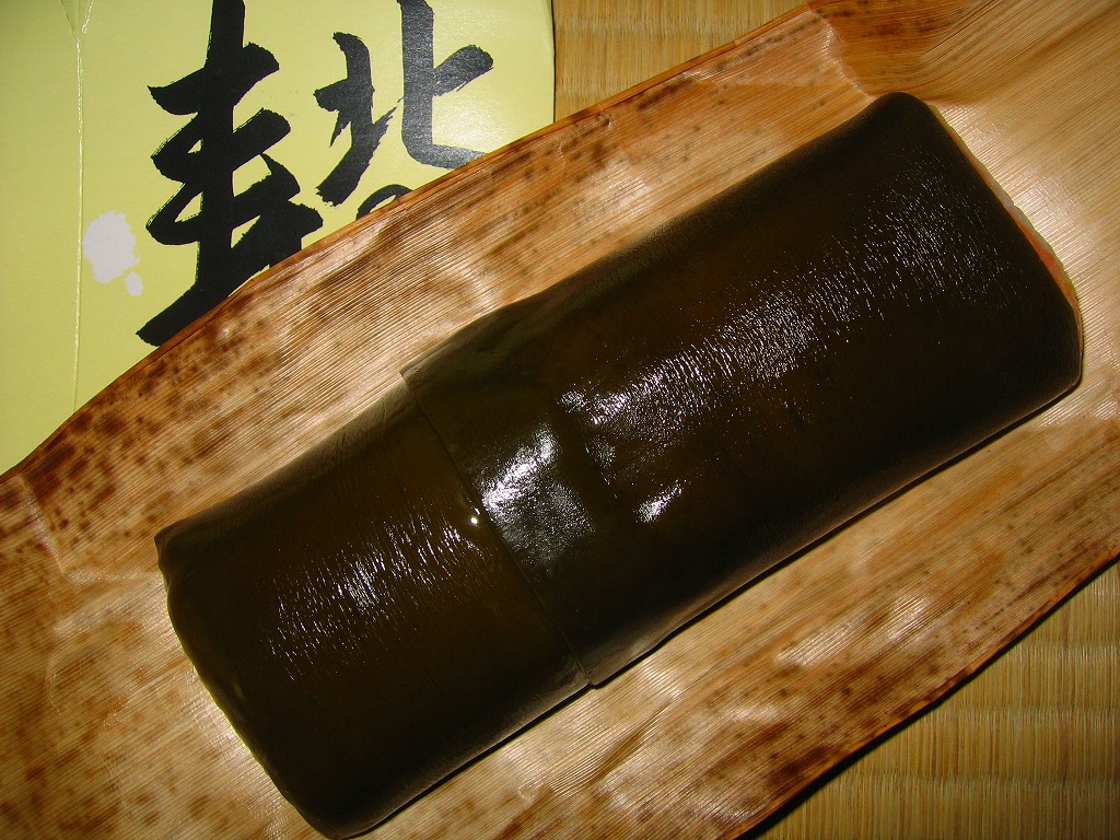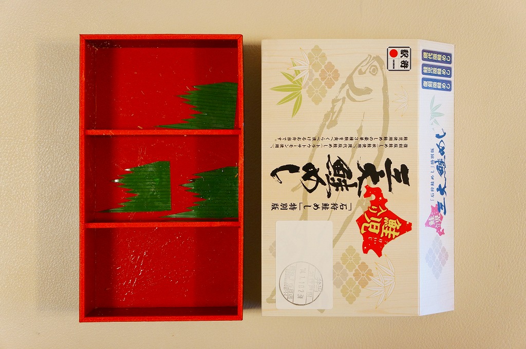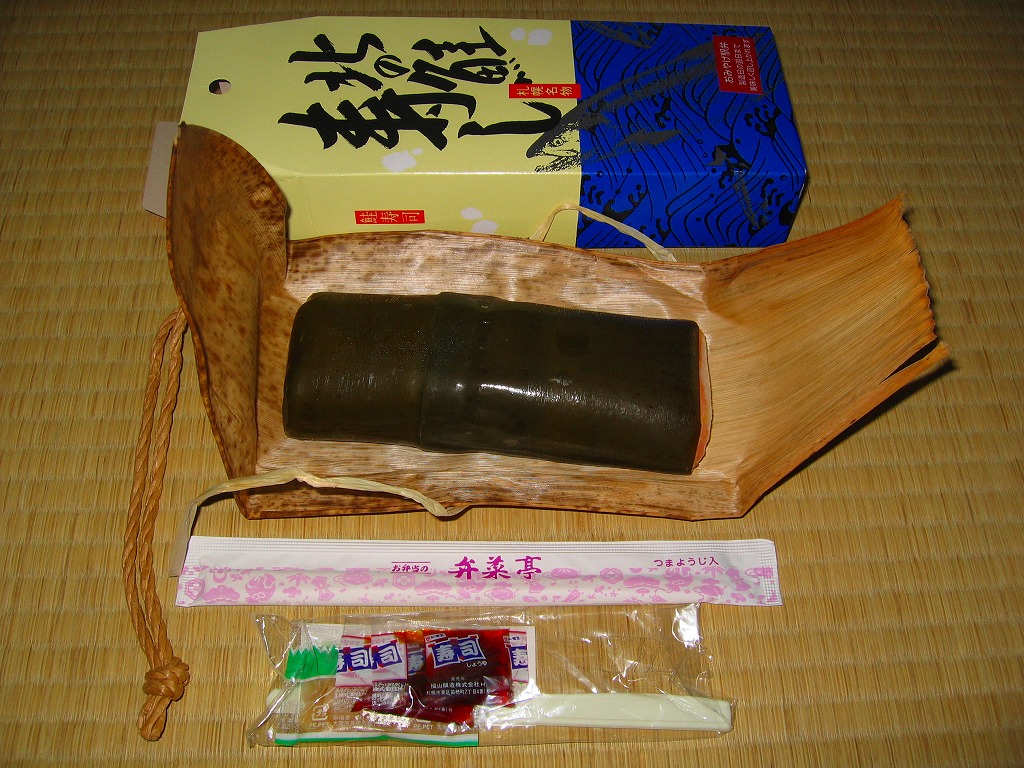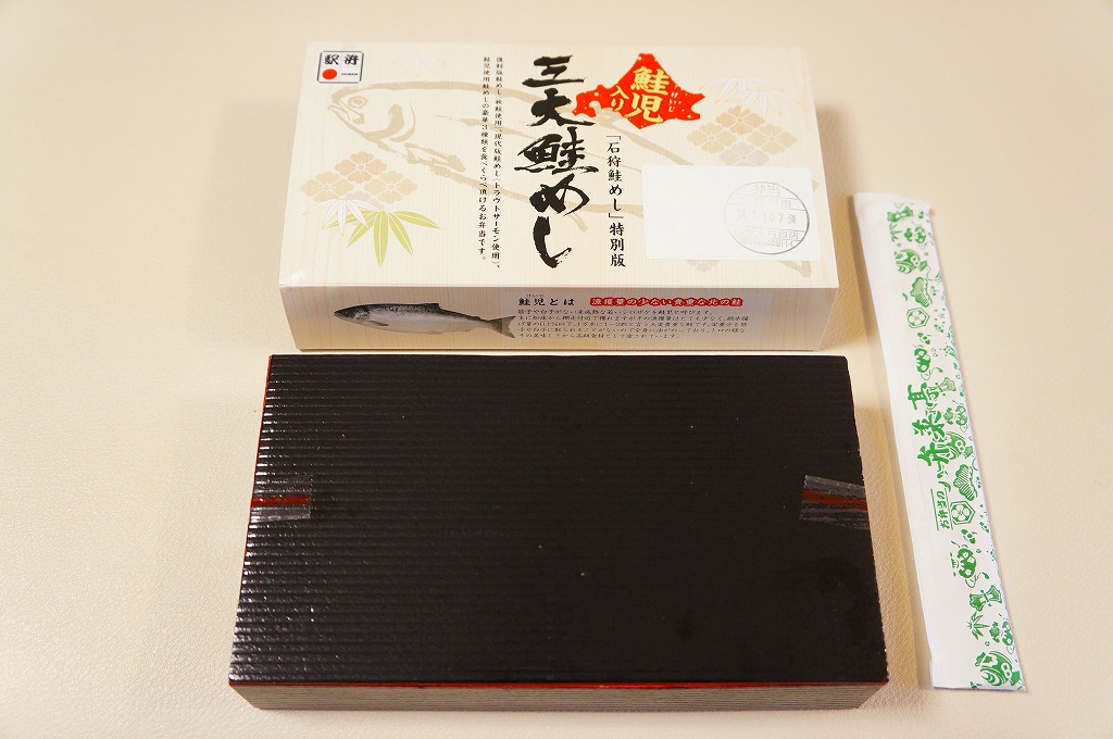 みずから「おみやげ駅弁」を名乗る変わり者。竹皮に包んだ棒寿司を紙箱に詰める。中身は大葉を含む棒状酢飯を鮭の身で巻き、さらに厚めの真昆布で巻く。
