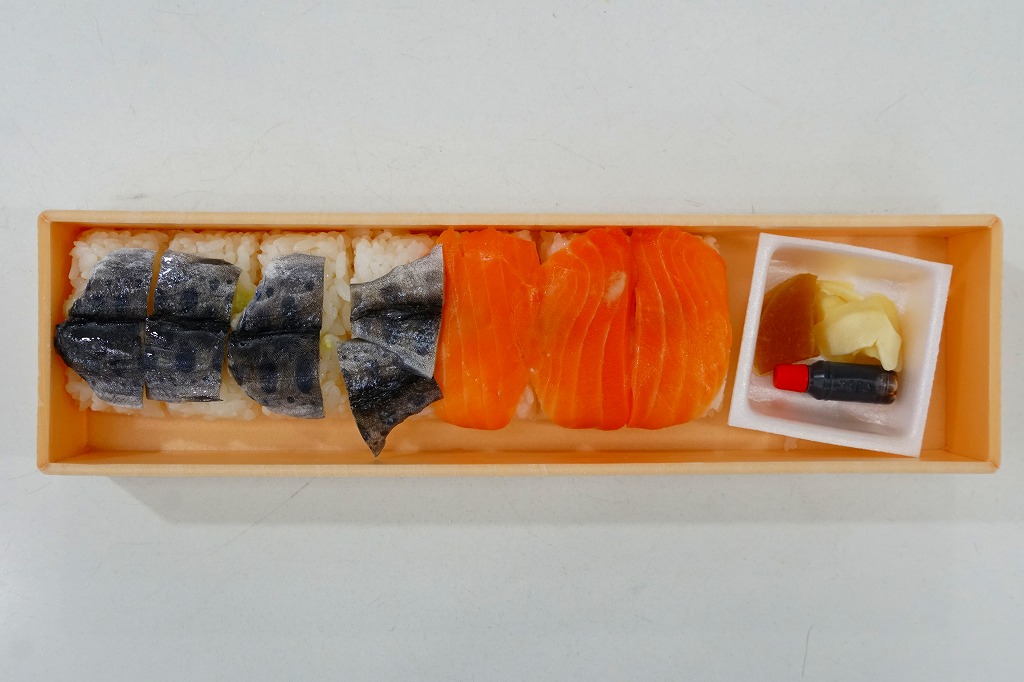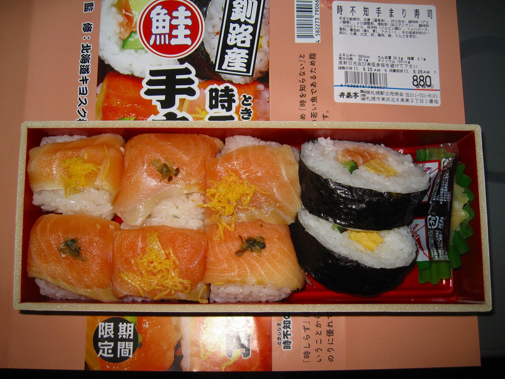 細長い長方形の容器に透明なふたをして、中身の写真を美しく印刷した掛紙を巻く。中身は手まり鮭寿司が6個と、鮭と玉子焼ときゅうりを巻いた太巻きが2切れ。調製元は札幌駅の駅弁屋なのに、外観、内容、風味とも札幌駅弁の雰囲気はなく、鮭は回転寿司で流れるサーモンのような水っぽさがあり、手まり寿司は球形になり切れていない。名物ではなく、軽食であればOK。