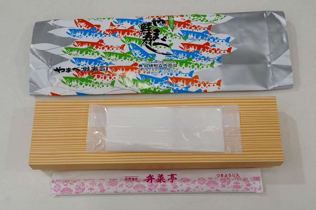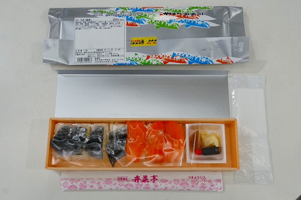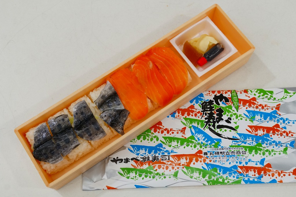 1969(昭和44)年の発売。札幌駅で半世紀の歴史を刻んだ、伝統の駅弁。細身の折箱を包む包装紙の、銀地に多数の魚拓が泳ぐ絵柄も、また半世紀変わらないものか。中身は小柄なやまべ(ヤマメ)寿しが4切れと鮭寿しが3切れに、ガリと奈良漬が少々。今時に珍しい、ワサビ入りの商品である。小食や小腹かおつまみに最適。価格は2004年時点で680円、2009年時点で700円、2014年時点で中身からやまべ1個とパインとチェリーを削り600円、2023年時点で680円、2024年時点で750円、11月から780円。