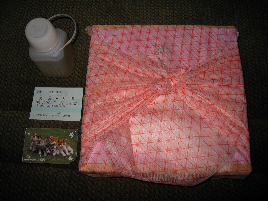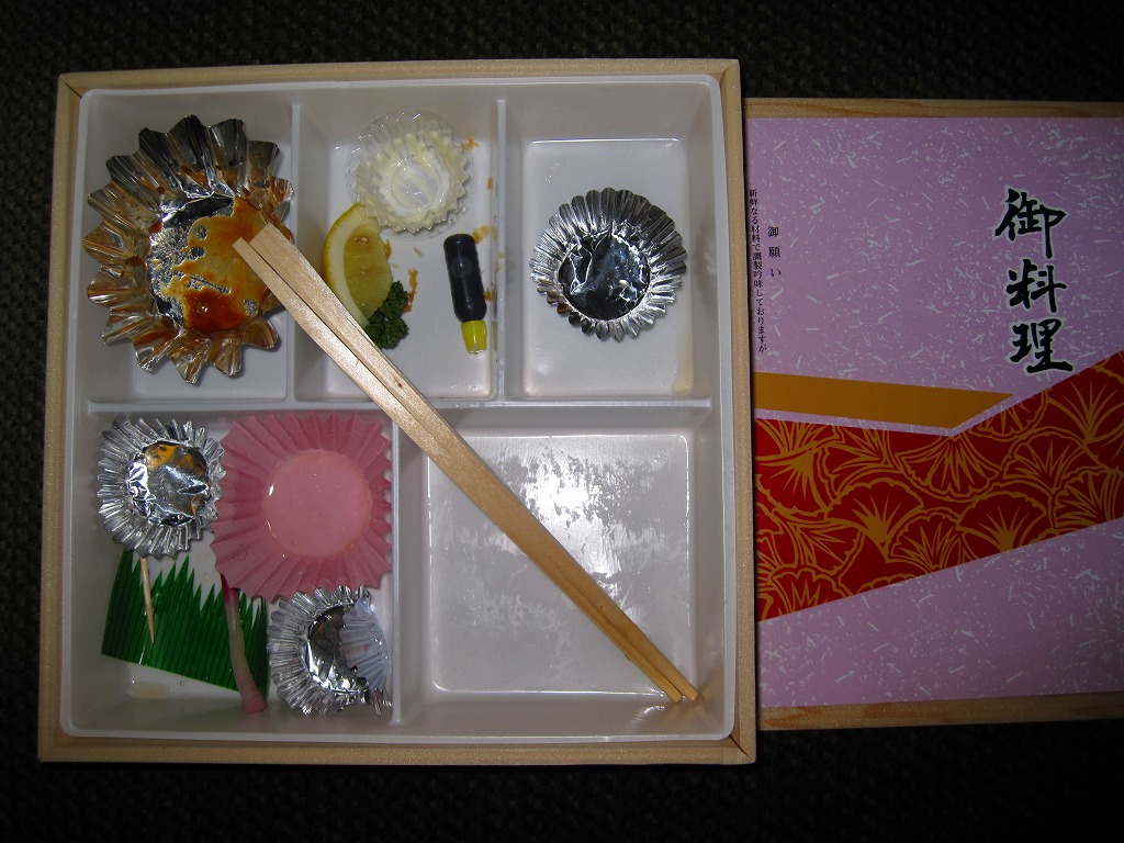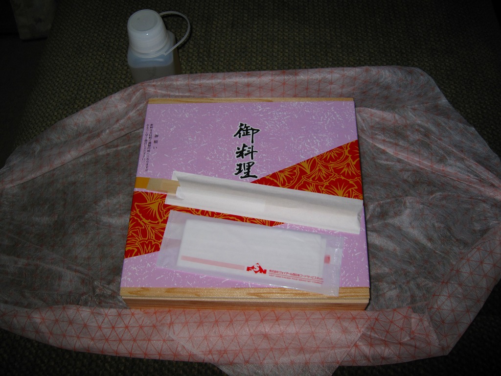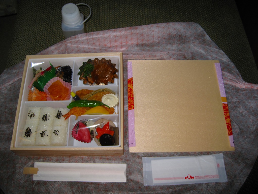 大阪発札幌行の寝台特急列車「トワイライトエクスプレス」で食べた、夕食向けに列車内で予約を取りに来る注文弁当。大きな正方形の容器を使用、これにセロテープで掛紙を貼り、風呂敷で包む。中身は俵飯、ミニハンバーグ、海老やカボチャなどのフライ、レンコンやサトイモなどの煮物、焼き鮭、ひじき、山菜、ゼリーなど。素材良好、分量もやや多めな、上質感のある仕出し弁当。
