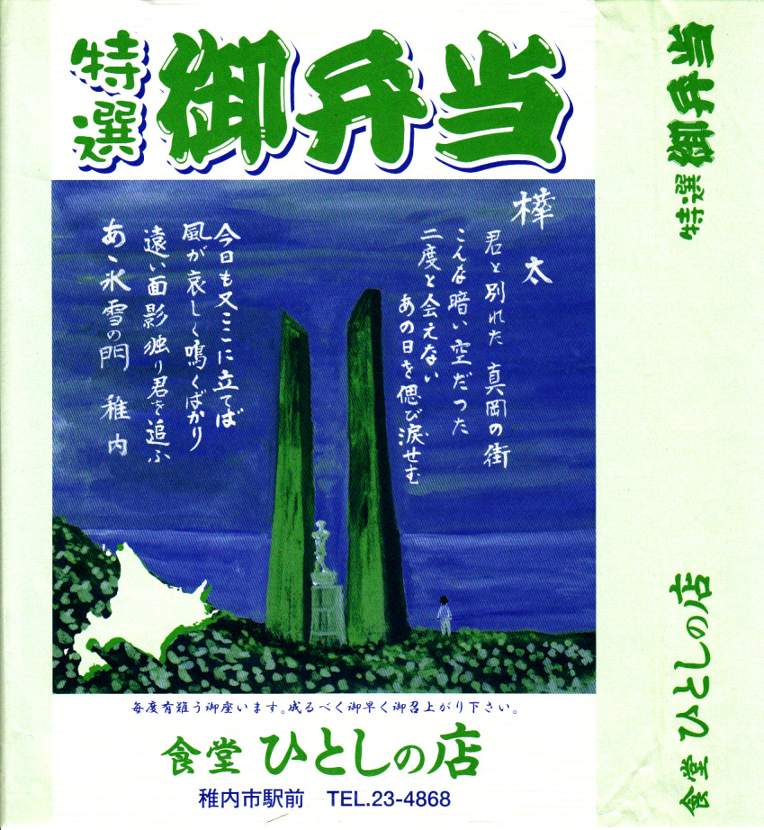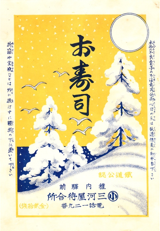おそらく1920年代、大正時代末期か昭和時代初期のものと思われる、昔の稚内駅弁の掛紙。あるいは当時に稚内駅を名乗った、現在の南稚内駅の駅弁の掛紙かもしれない。三河屋は当時の稚内駅前の旅館だった模様。第二次大戦後に駅弁は残らず、日本食堂の営業所ができた後に上記の調製元に替わったらしい。