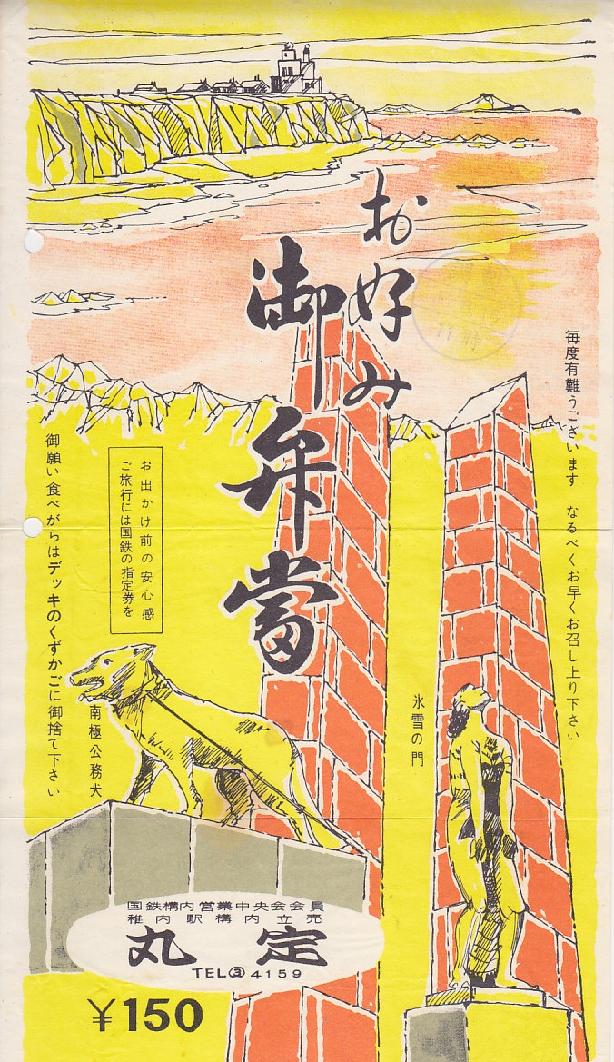 1971(昭和46)年8月16日11時の調製と思われる、昔の稚内駅弁の掛紙。氷雪の門と南極公務犬と記し、稚内公園や野寒布岬あたりの光景を組み合わせた。