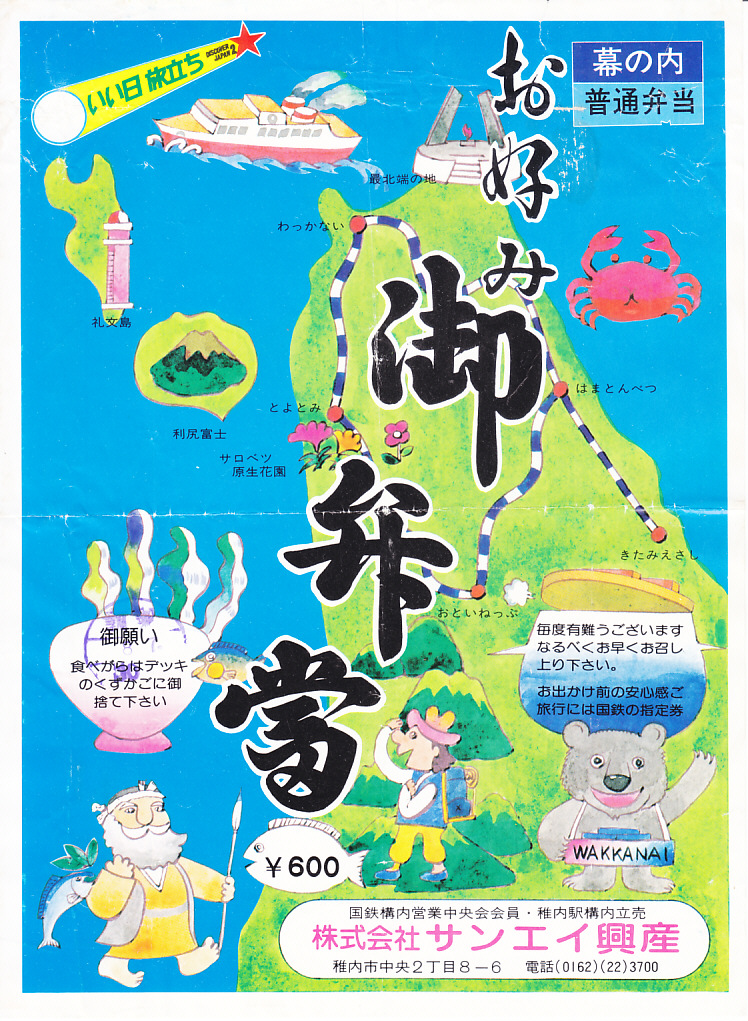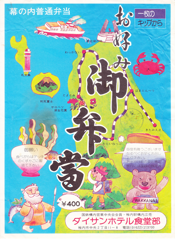1977(昭和53)年8月5日10時の調製と思われる、昔の稚内駅弁の掛紙。宗谷本線の一部と天北線となぜか興浜北線の路線図に、アイヌと登山者とクマ、カニと貝とワカメと釜、フェリーと礼文の灯台と利尻富士と最北端碑をちりばめた。調製元のダイサンホテルは、1975(昭和50)年頃の数年間、稚内駅で幕の内弁当を販売した構内営業者と考えられる。