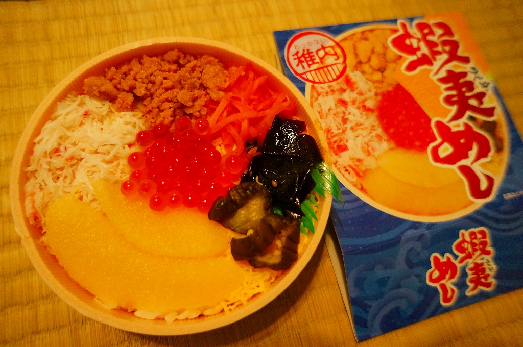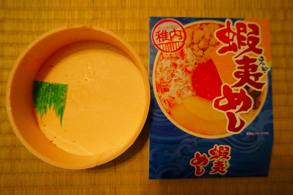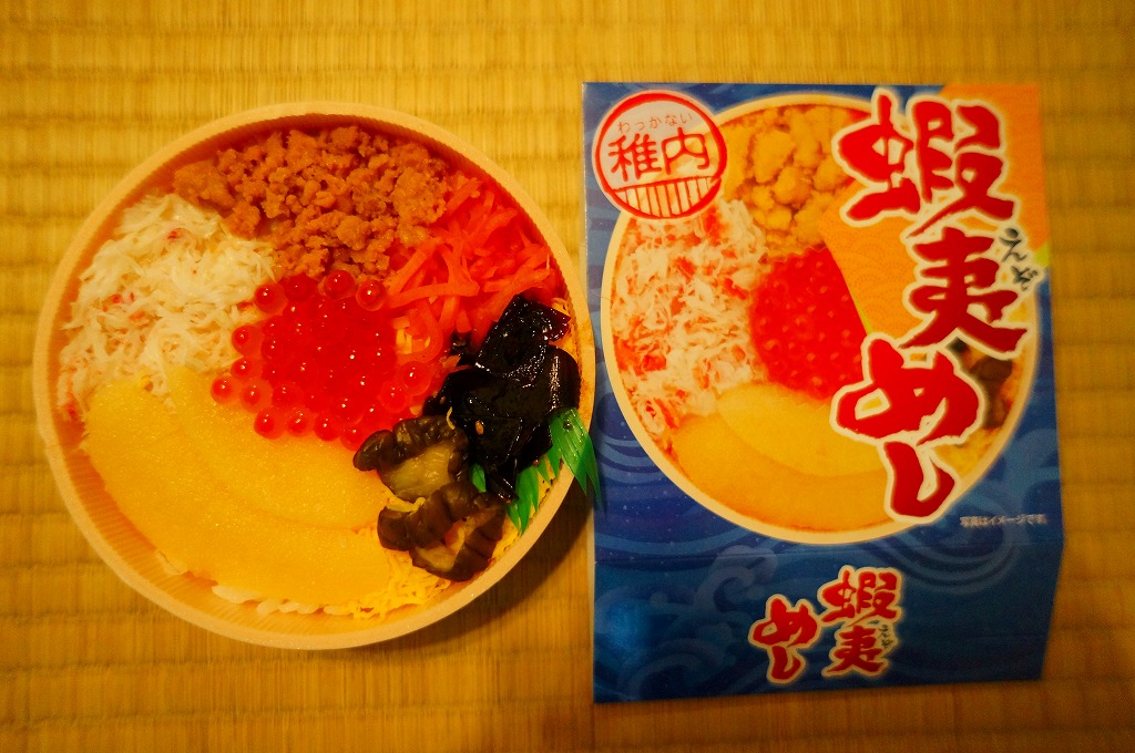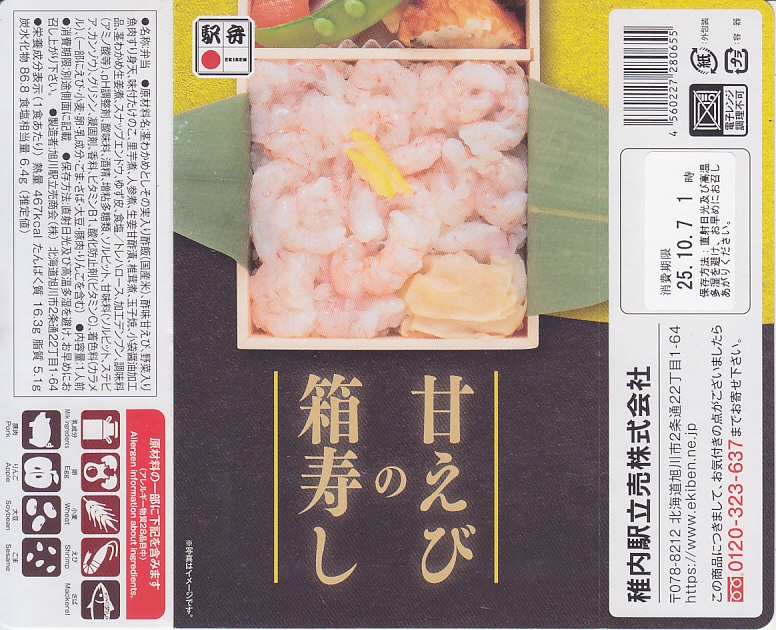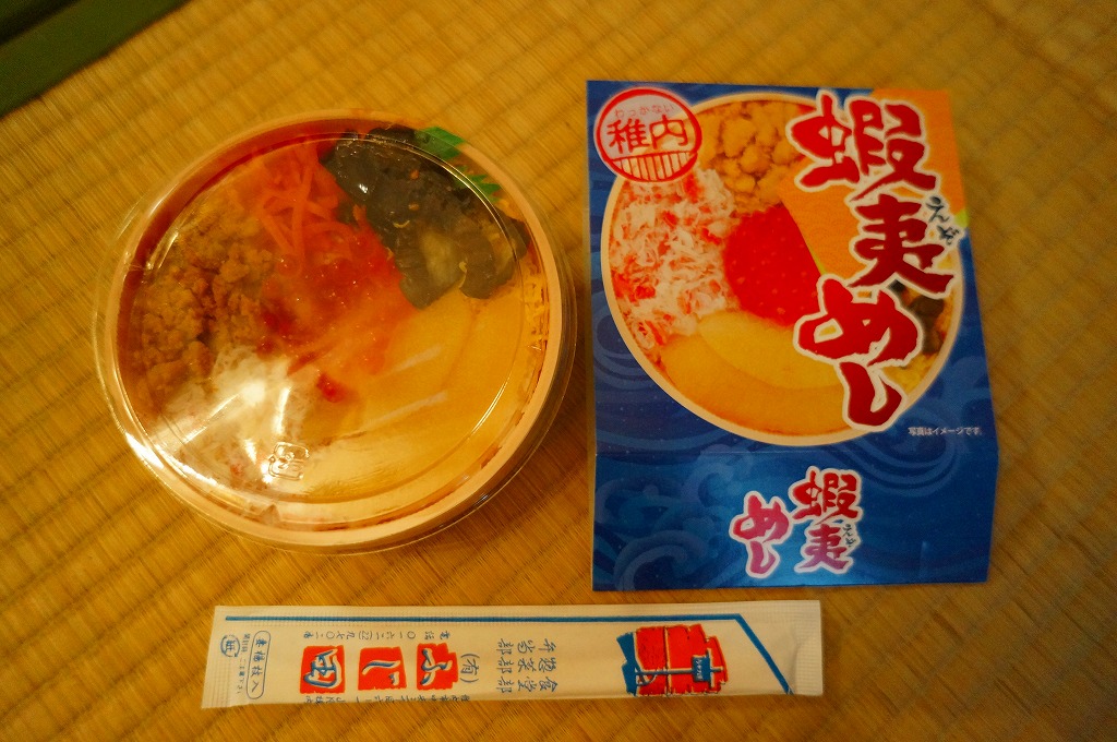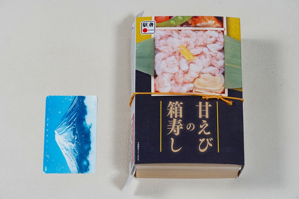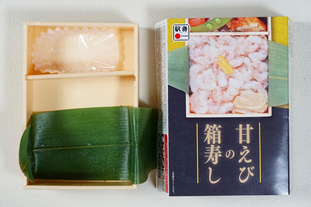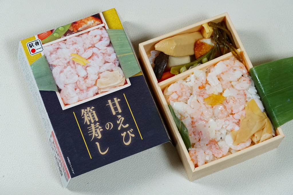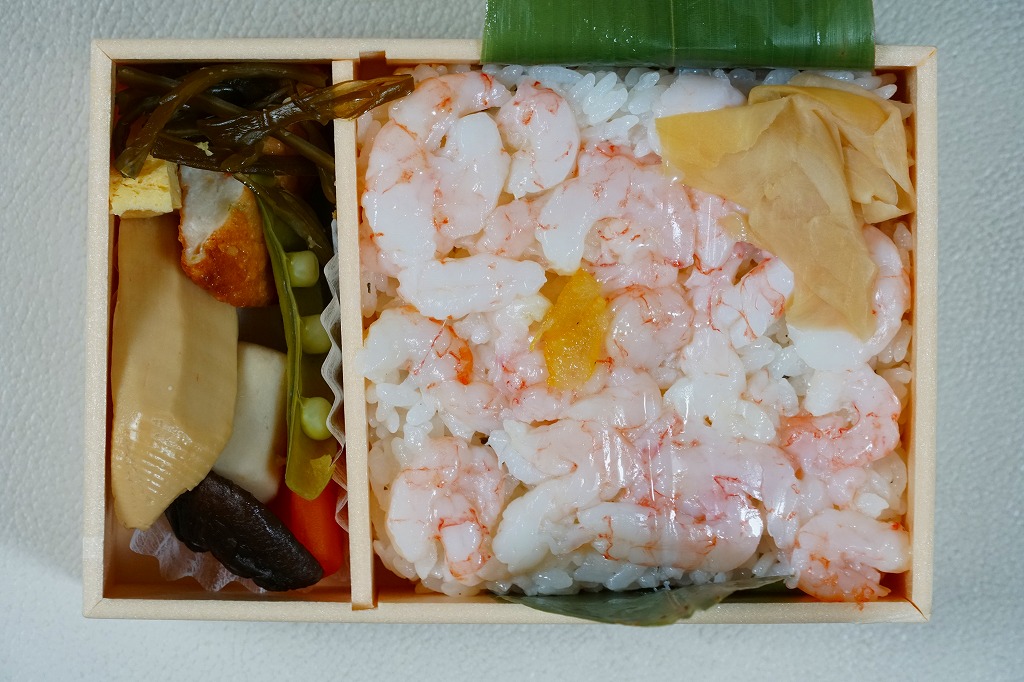 秋冬の駅弁大会シーズンに向けた、2025(令和7)年秋の新商品として、9月に全国で発売。商品の名前やふたの写真のとおり、箱状の容器に本物の笹の葉を1枚敷き、茎わかめとしその実を混ぜた酢飯を詰め、甘えびで覆い、ゆず皮と甘酢生姜を載せ、煮物とさつま揚げ、玉子焼きと茎わかめを添え、だし醤油と伯方の塩を添付する。メインの甘えびは冷凍むきえびのような姿で、比較的たっぷり詰めてくれていて、これで御飯が進むほか、中身の小細工で味の切り口が多様なうまい駅弁になっている。