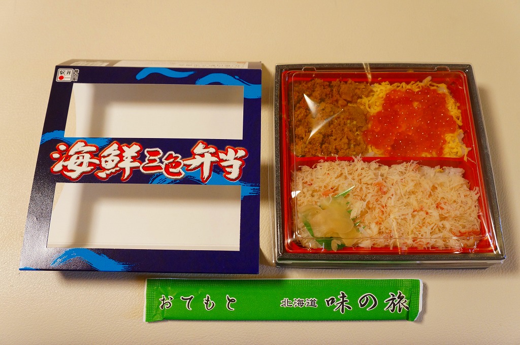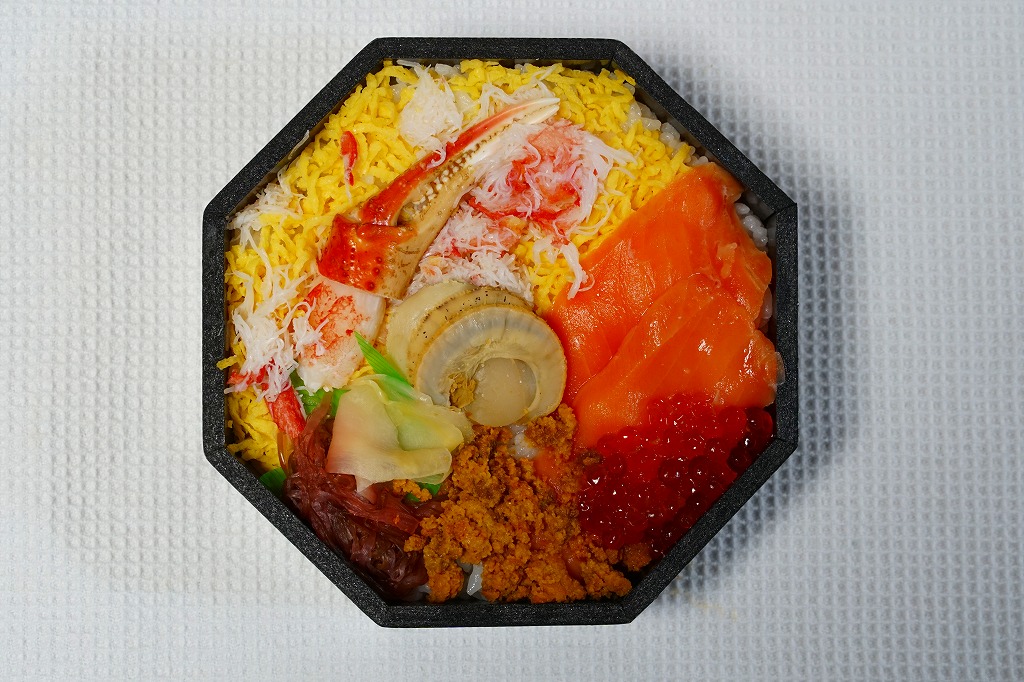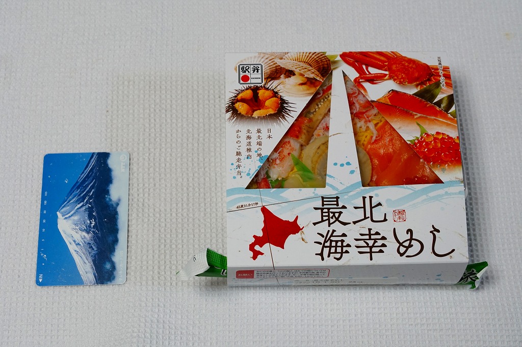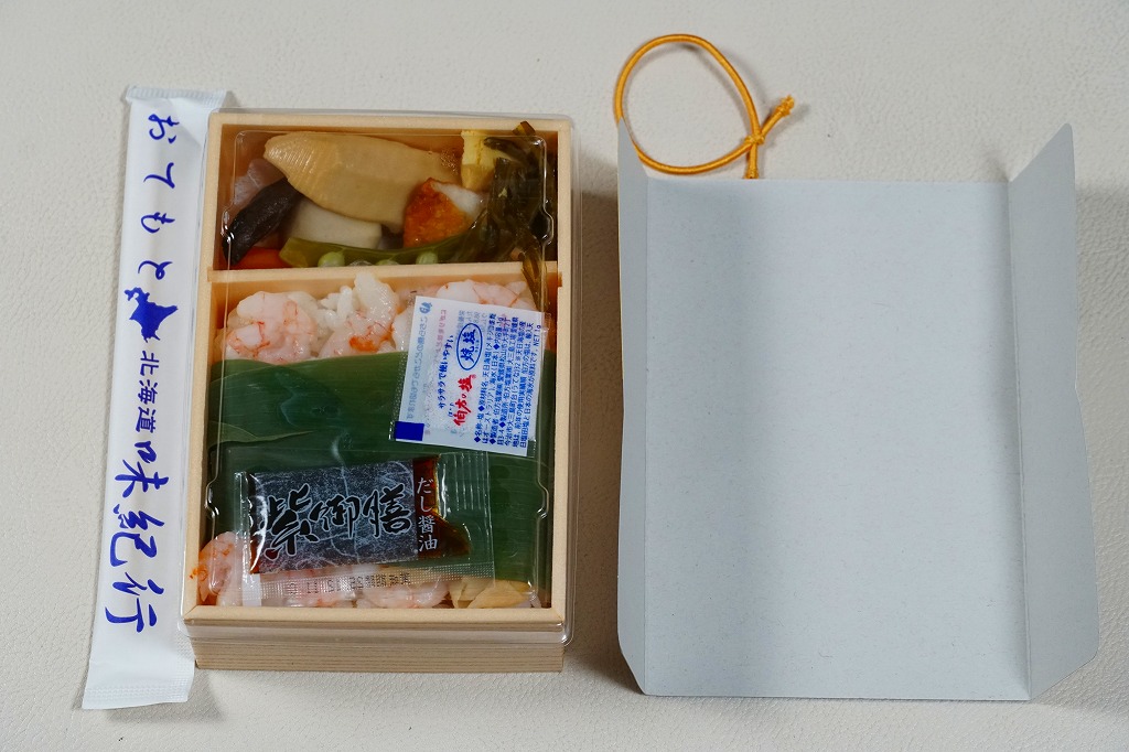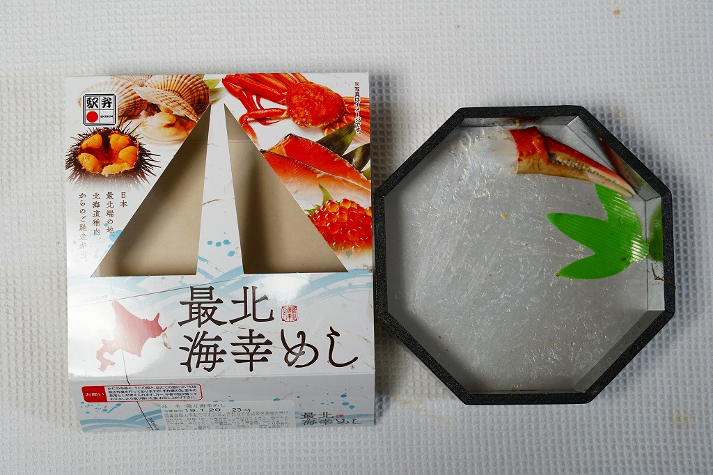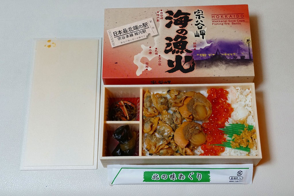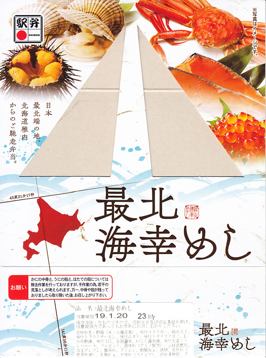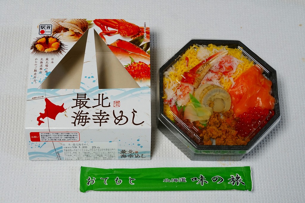 2018(平成30)年9月の新商品か。黒い正八角形の容器に酢飯を詰め、カニ、ウニ、イクラ、サーモン、ホタテ、錦糸卵、ワカメ、ガリで覆う、わかりやすい北の味の駅弁。スリーブの窓開きが宗谷岬の最北碑を思わせる三角形で、その点だけが他や旭川や釧路と異なる点か。価格は2018年の発売時や2019年の購入時で1,070円、2021年時点で1,180円。2021年の春頃に終売か。