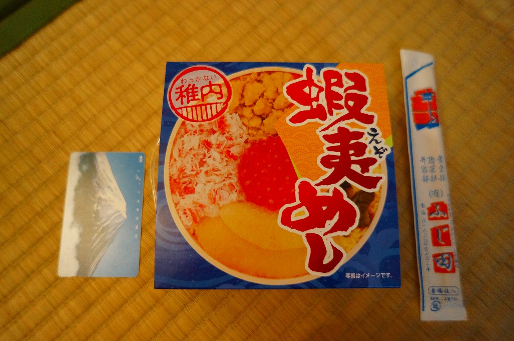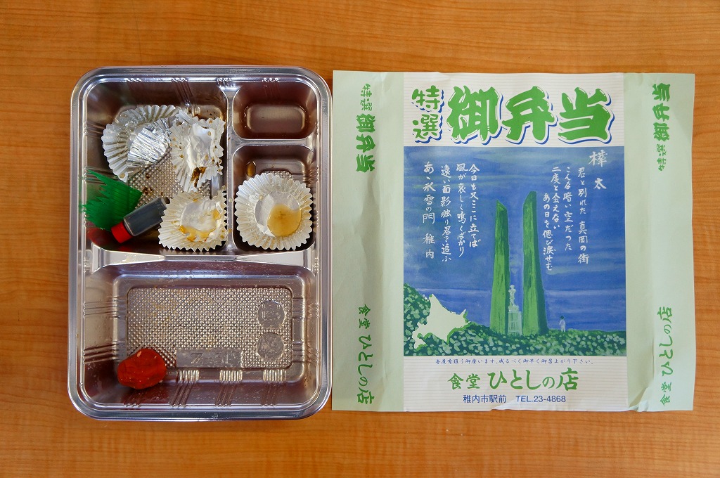 パッケージの中身写真と実物が寸分違わない中身は、味もそのとおり。パッケージ本体に調製元の情報がないため、添付の割りばしの袋から想像した。この商品ははたして、稚内駅再開発ビルの食堂で販売されているのだろうか。長万部駅の今は知られざる元駅弁と同じ名前であることも気になる。2013年頃まで売られた模様。