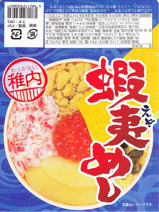 2011(平成23)年から各地の駅弁催事でのみ収穫報告がある商品。円形の容器に透明なふたをして、中身の写真でチープにデザインしたボール紙の枠にはめる。中身は白御飯の上をカズノコ、カニほぐし身、蒸しウニ、紅生姜、錦糸卵と昆布と漬物、イクラで覆うもの。