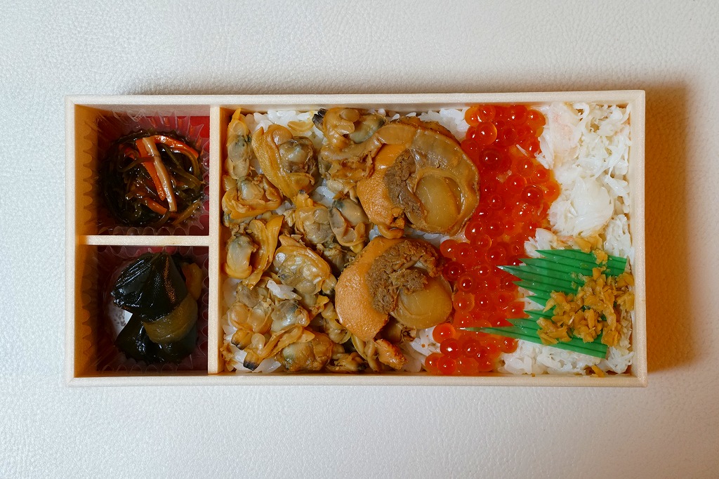 中身は酢飯をアサリ醤油煮、ホタテ醤油煮、イクラ醤油漬、カニの酢締めのほぐし身で覆い、昆布巻と松前漬と山わさび醤油漬を添えるもの。催事場での盛り付けとはいえ、飯の酢が底にたまり、具の味付けや酢がきつくて味や香りが飛ぶ。稚内駅で買えた弁当とはまるで異なる催事屋商品。催事場内に現地での販売を示す写真を掲示しており、稚内の弁当がこんなものに変わってしまわないか心配になった。この商品は以後もごくまれに、スーパーの駅弁大会に出てきた模様。2020年のみの販売か。