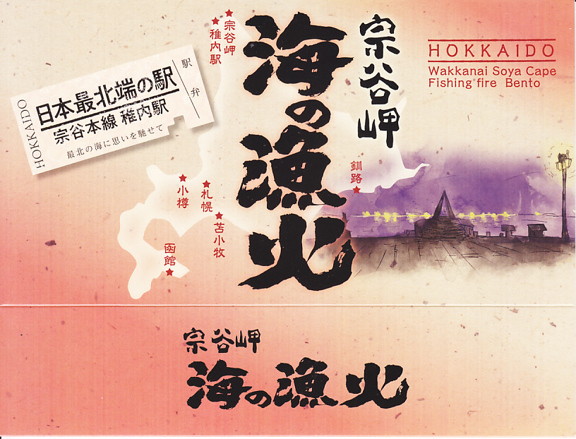 札幌駅から特急列車「スーパー宗谷」で約5時間の、日本最北の駅。稚内市は北海道の最北部に位置する、人口約3万人の港町。漁港として、第二次大戦までは樺太への窓口として、現在は利尻や礼文や道北観光の玄関口としてよく知られる。駅弁は駅の隣の再開発ビル「キタカラ」の、売店に入荷したり、そば屋で売られる。1928(昭和3)年12月26日開業、北海道稚内市中央3丁目。