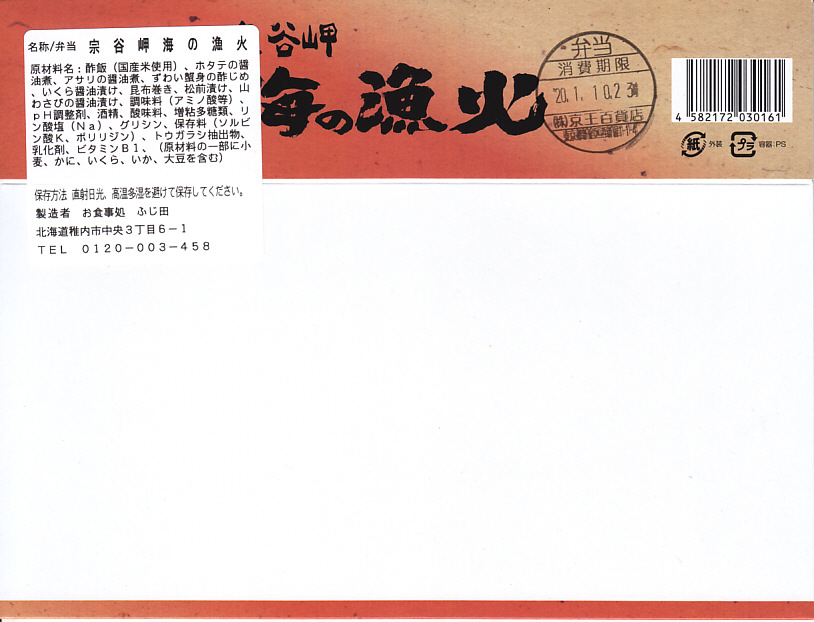 稚内駅では売られず、スーパーやデパートなどの催事で売られる疑義駅弁。2020(令和2)年1月の京王百貨店の駅弁大会で実演販売。輸送や実演で催事に出てくる稚内駅弁は、今までは稚内駅立売商会のものと決まっていたが、ふじ田が出てきて驚いた。普段は駅の隣の商業施設の立ち食いそば店で、以前は駅舎の食堂で、惣菜容器に商品名を貼り付けた弁当も販売している調製元。それを知っていると、見た目で駅弁らしい、催事で映える賑やかな絵柄のスリーブを使うところから違和感を覚えた。