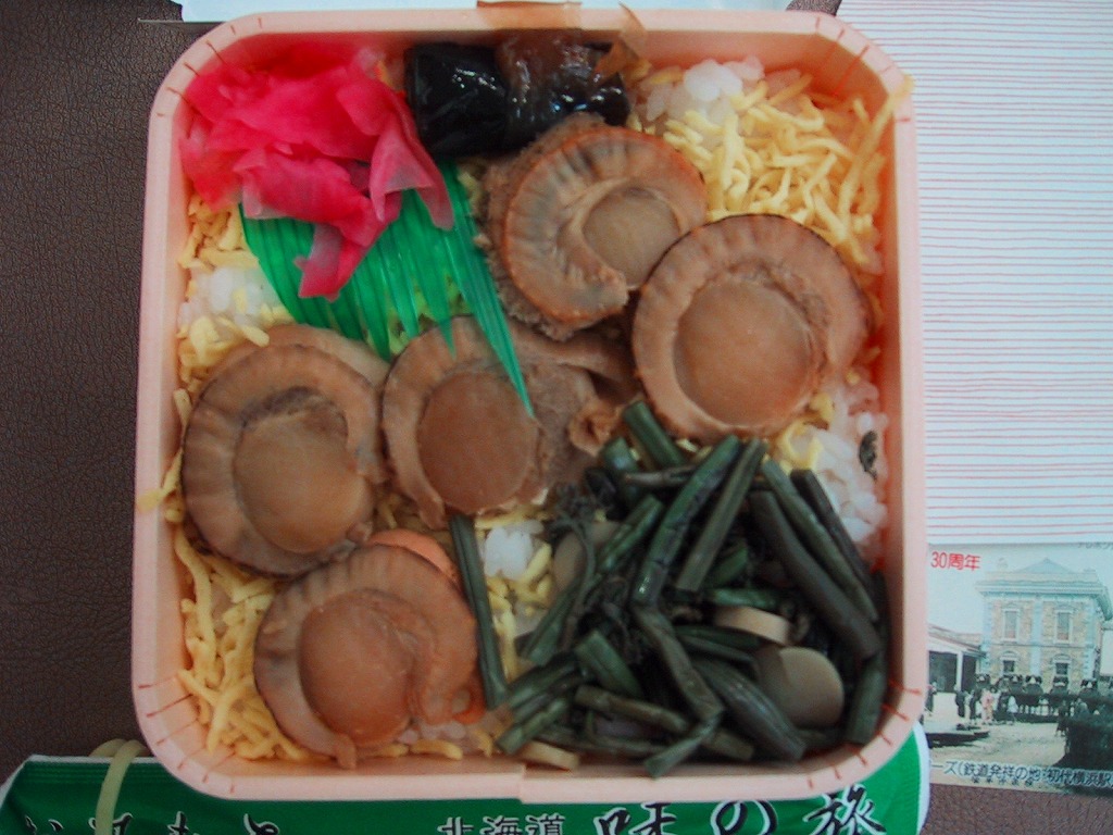1998年頃の発売か。小ぶりでやや背の高い正方形の容器に、ふたと掛紙を兼ねた光沢紙を載せて輪ゴムでしばる。中身は酢飯の上に帆立を5個ほど配置し、錦糸卵と山菜類を添えただけ。具や全体の分量から、北海道の駅弁としてはやや割高感がある。味は見た目のまま。価格は2002年の購入時で880円、2014年時点で940円。2019年に終売か。