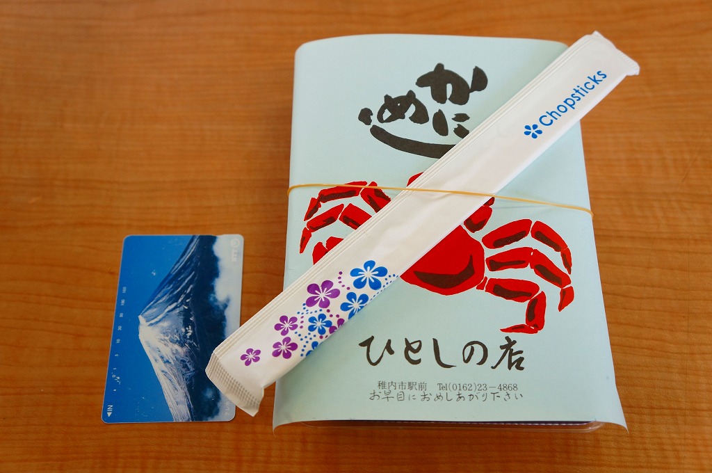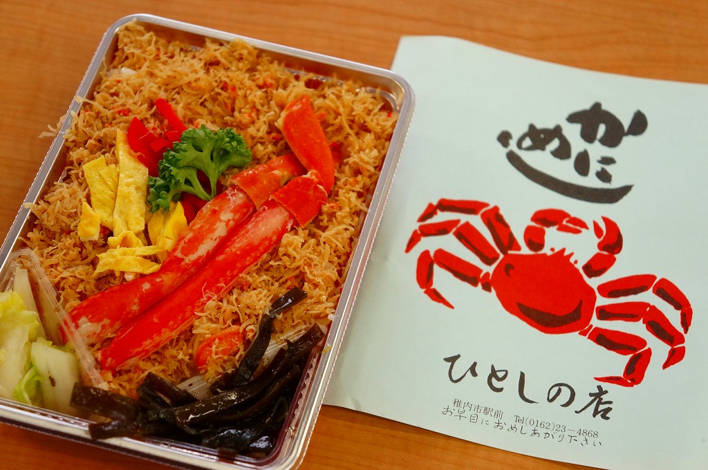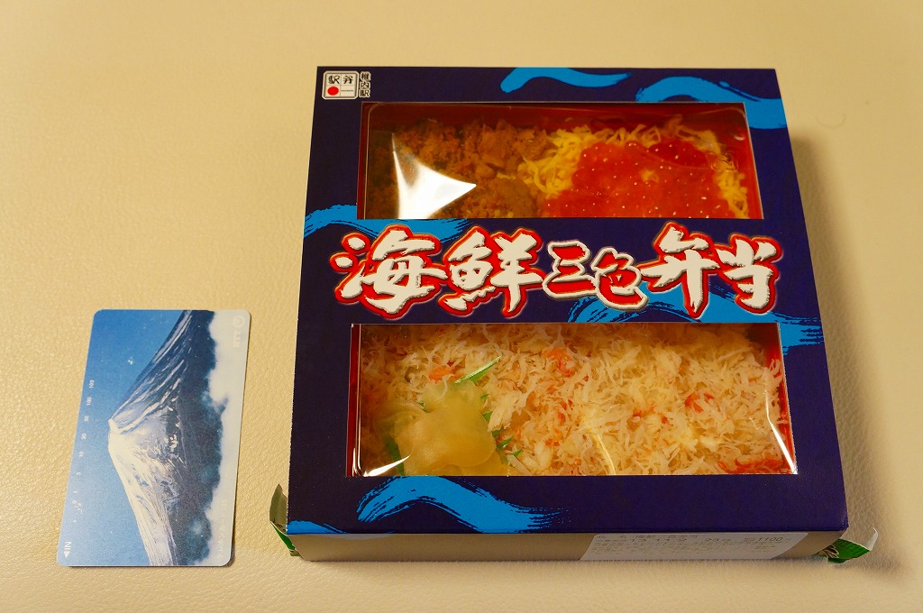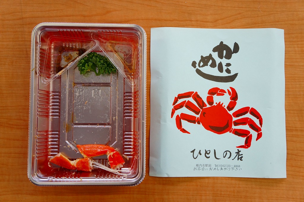 これは駅弁でなく、稚内駅の駅前の食堂で買えたお弁当。市街地再開発事業で2012(平成24)年に、まるで新興住宅街のようにきれいになってしまった稚内駅の駅前交通広場の先で、「お弁当 かにめし 幕の内」の看板にひかれて買ってみた。