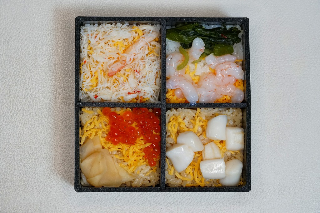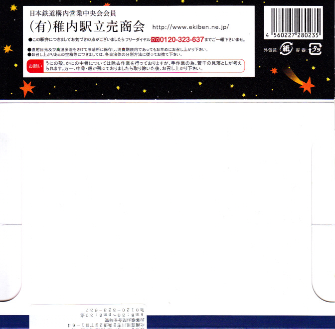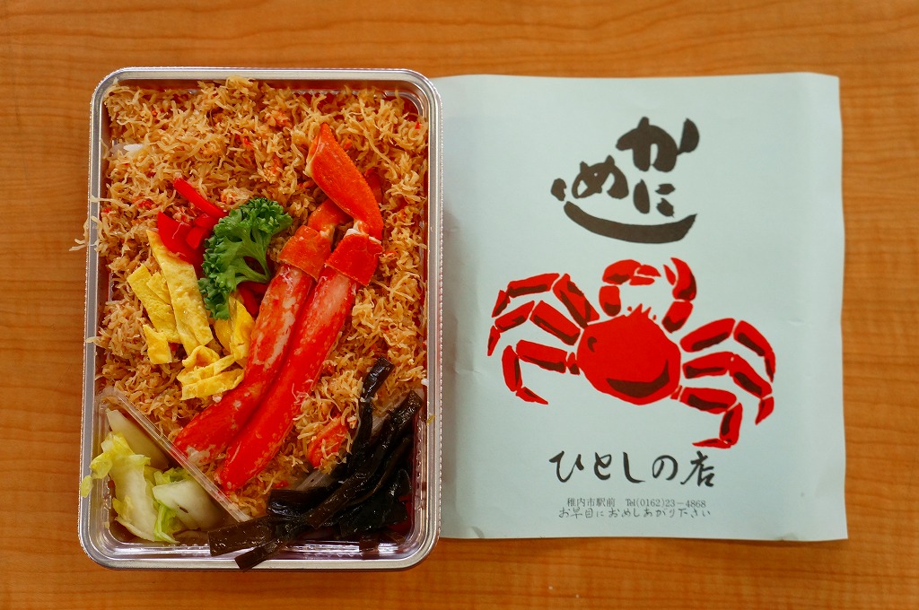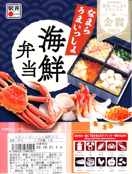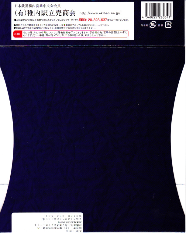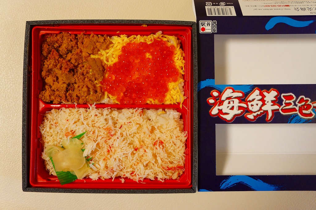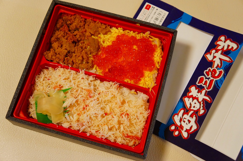 2013(平成25)年度の秋冬の駅弁大会シーズンに向けた新作か。酢飯に味付うに、ズワイガニ酢漬、醤油漬いくら、錦糸卵を貼り付けて、生姜酢漬を添えるもの。どこから見ても特徴のない、催事向け商品に見える。まずいものではない。このシーズン限り、半年間の販売か。