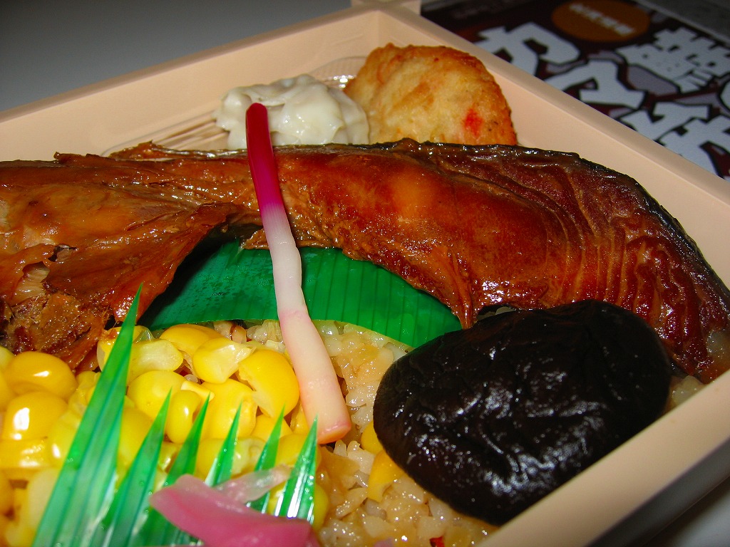 秋冬の駅弁大会シーズンに向けた、2006(平成18)年秋の新商品。現地で売らない疑義駅弁と考えられる。他駅でも見たような強度のある井形プラ容器に、掛紙を兼ねて商品名を書くボール紙でふたをして、割りばしを置いて輪ゴムで留める。中身は炊込おこわの上に鮭カマ、コーン、椎茸を置き、焼売やガニ天などが添えられる。
