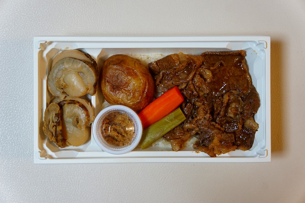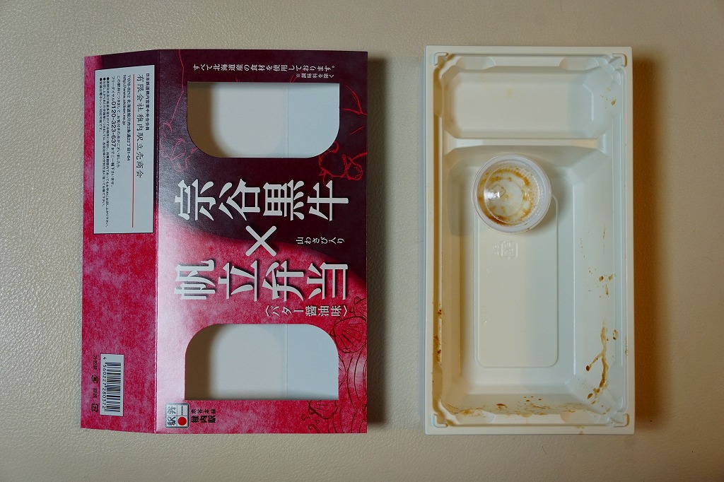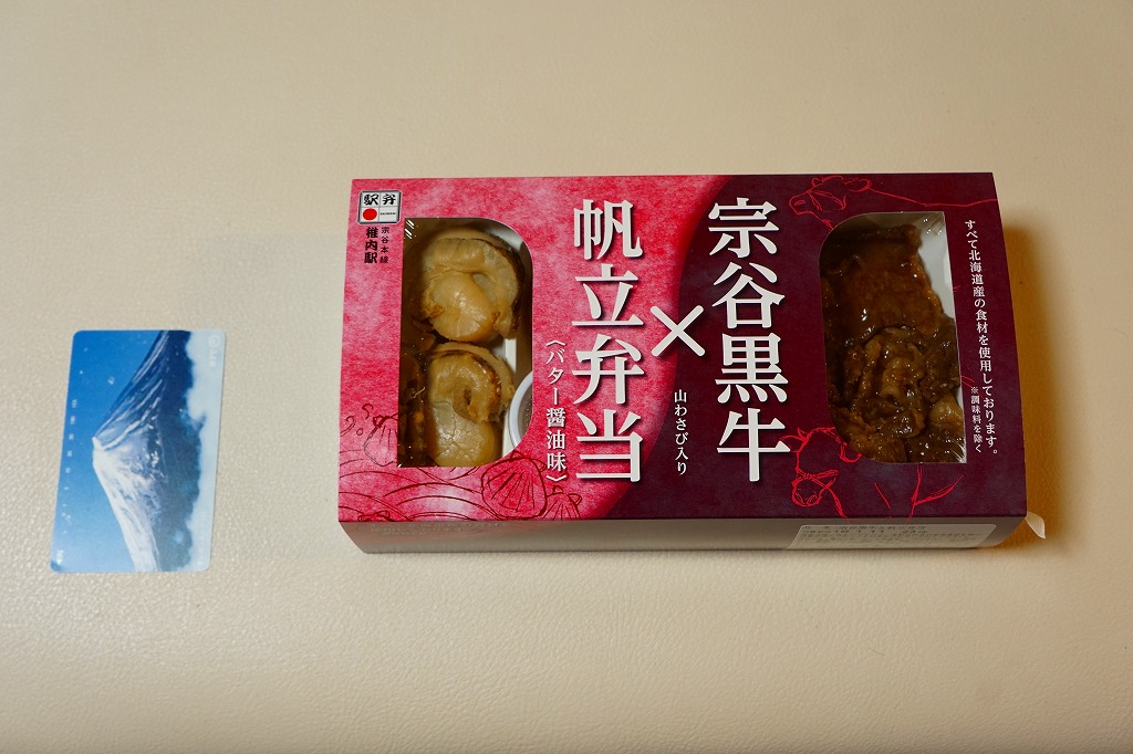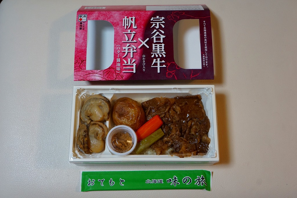 商品名がよく目立つパッケージの左右の窓からは、駅弁の名前になっている帆立と宗谷黒牛がそれぞれ見えている。中身は右側で白御飯の半分を牛肉煮で覆い、じゃがいも、にんじん、アスパラを添え、左側でバター風味のホタテ2個を付合せ。見た目にきれいなお弁当で、ボール紙枠のデザインを含めて、メリハリが効いた感じ。価格は2016年の購入時で1,200円、2017年時点で1,300円。2017年頃までの販売か。