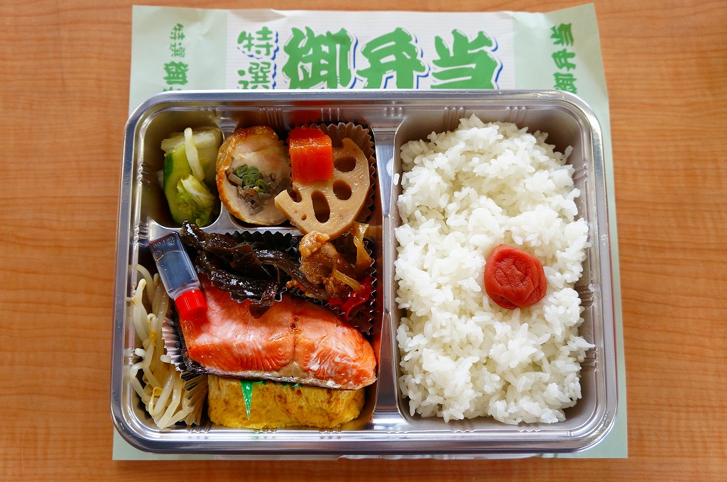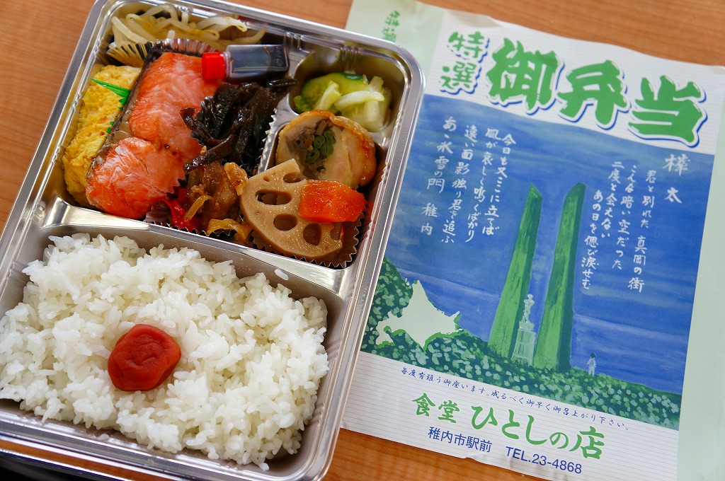 中身は、日の丸御飯、焼鮭、玉子焼、鶏肉巻、昆布、きんぴら、煮物、もやし、浅漬けなど。稚内公園の「氷雪の門」と樺太への思いを描いた掛紙は手書きのデザインで、そもそも市販の弁当に掛紙をかけていて、薄手のプラ容器は銀色に光り、これはホカ弁やコンビニが普及する前の、昭和の昔の懐かしい手作り弁当。見た目以上のボリューム感があった。