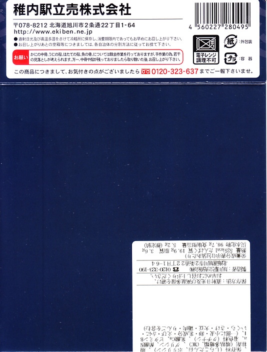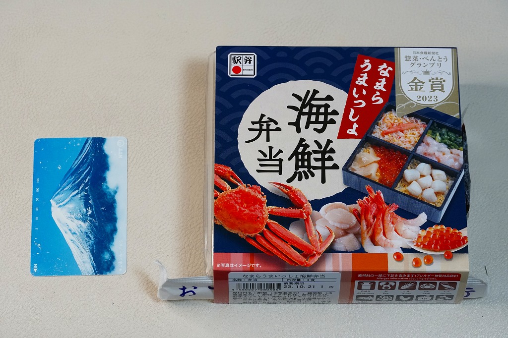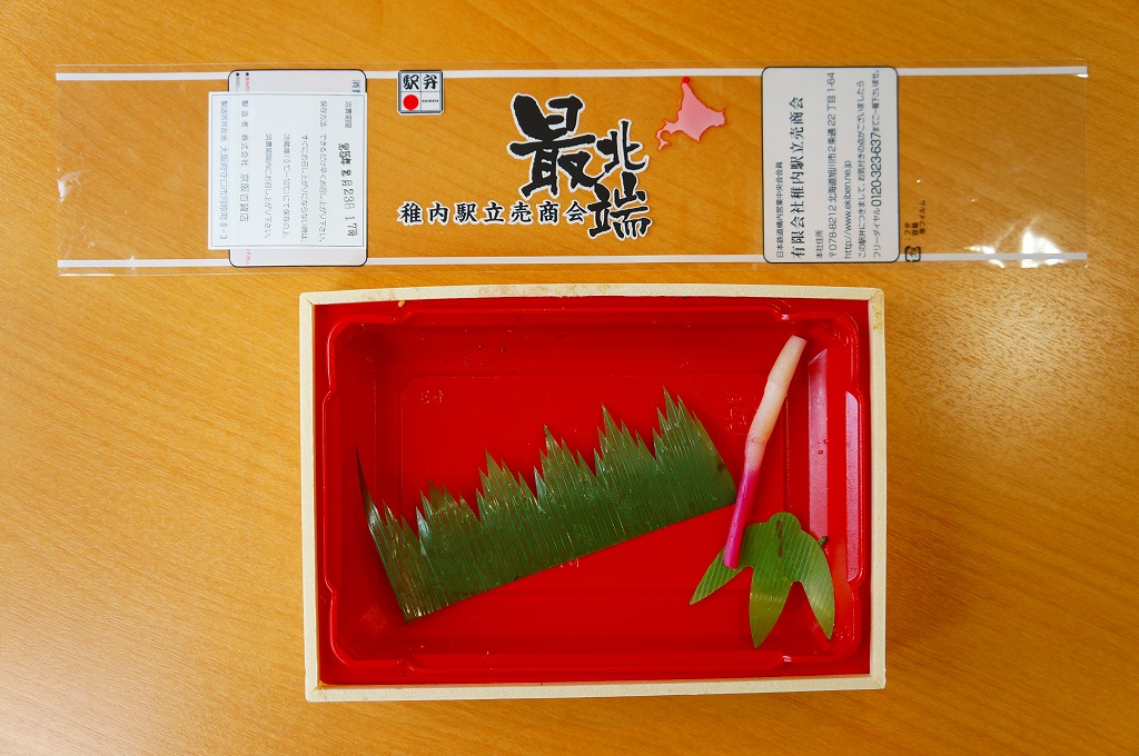 これはおそらくスーパーやデパートでは稚内駅の駅弁として売られ、ふたにも稚内駅の文字を含む会社名が見え、実際に稚内駅で販売されているはず。この調製元の駅弁は旭川で調製し、旭川、稚内、釧路の各駅で販売し、さらに2025年時点で千葉駅と東武鉄道の浅草駅でも販売し、東京や大阪の各駅でも常時輸送販売されているので、駅弁大会でも稚内駅でもない駅で出会っても驚いてはいけない。これもこんな感じで、東京駅で購入。