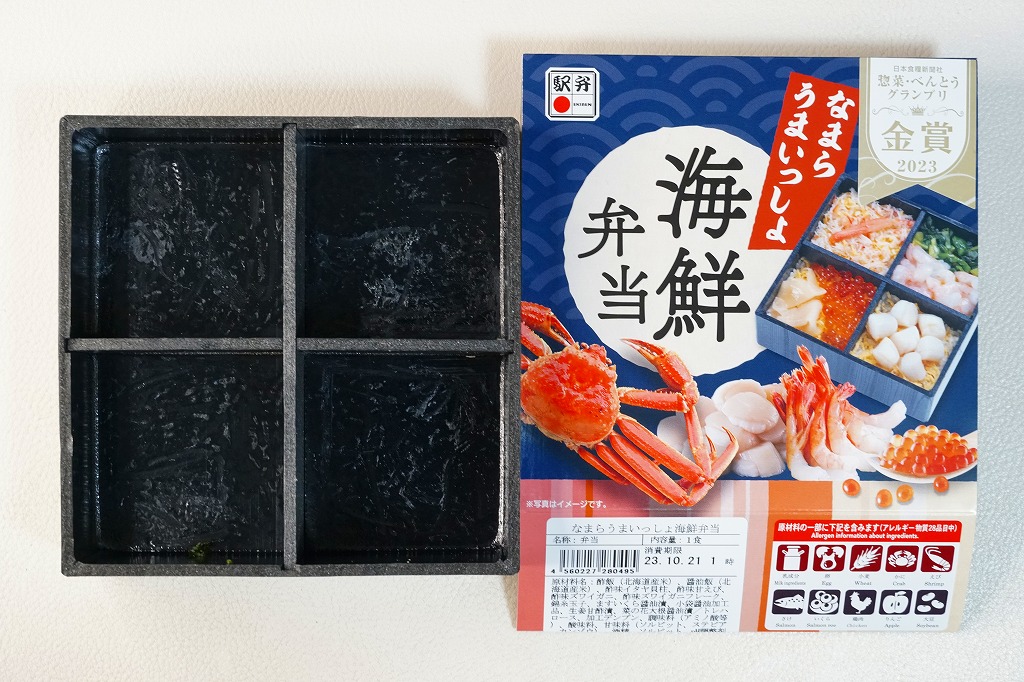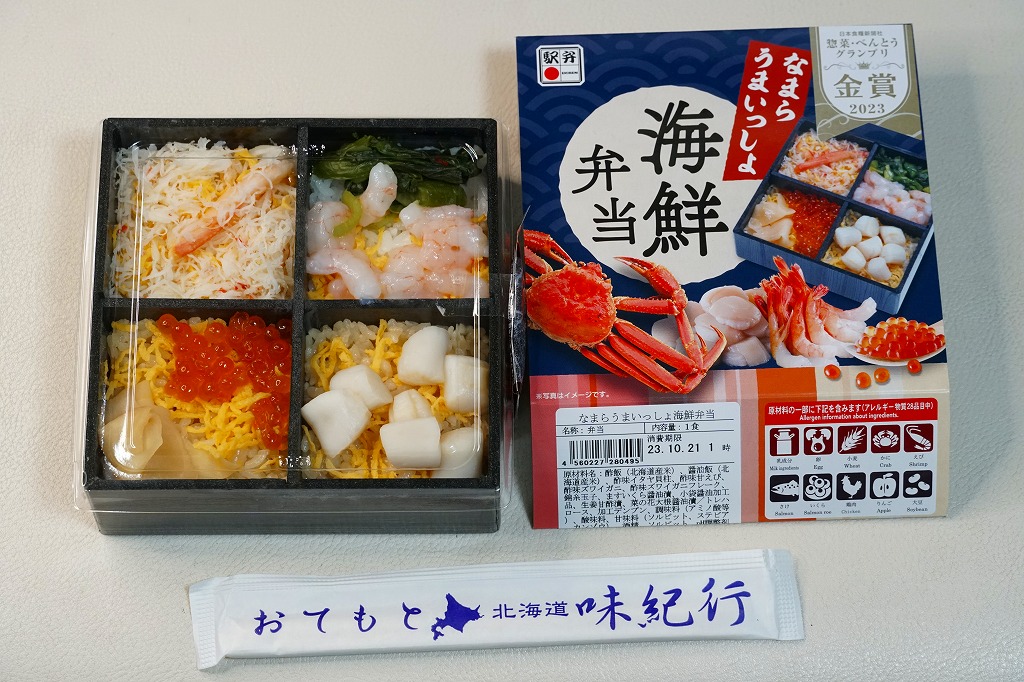 秋冬の駅弁大会シーズンに向けた、2019(令和元)年秋の新商品か。「なまら」は北海道で「とても」という意味。2022(令和4)年秋にウニを抜いてカニを半減しホタテとエビを入れるリニューアルで、スリーブの食材写真を差し替えて中身の写真を加え、日本食糧新聞社「惣菜・べんとうグランプリ2023」で金賞に認定。松花堂弁当のような4区画の正方形容器を、そんなスリーブに収める。