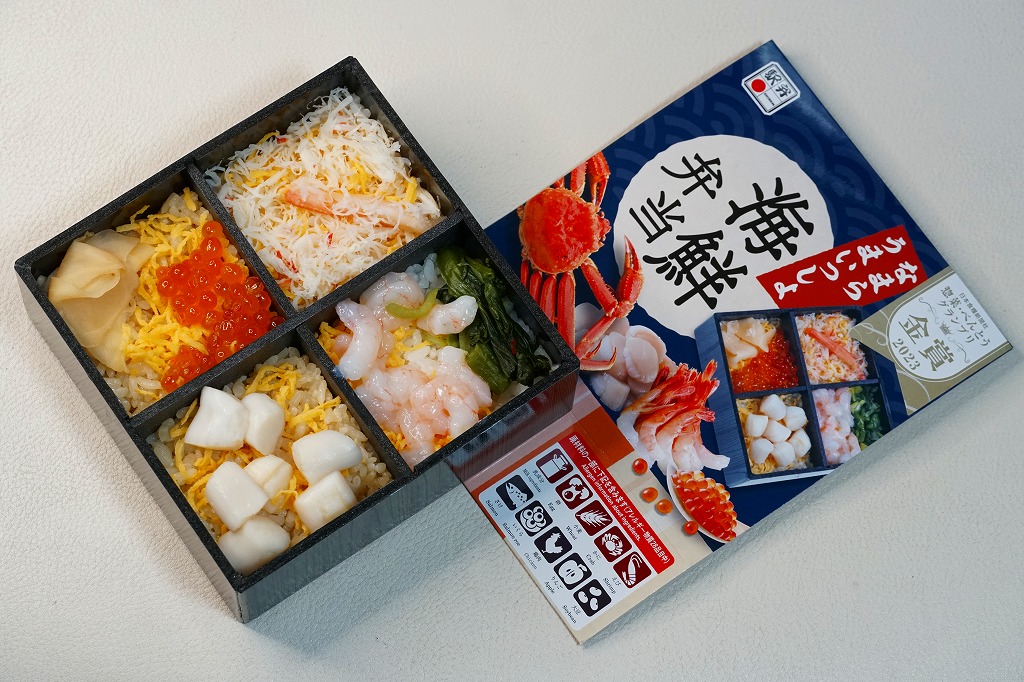 中身は、茶飯に錦糸卵を載せてイクラとガリを載せるイクラガリ丼、酢飯に錦糸卵を載せてカニほぐし身で覆うカニ丼、茶飯に錦糸卵を載せてホタテ貝柱を並べるホタテ丼、酢飯に錦糸卵を載せて甘えびと菜の花を載せるエビ丼で、4種類のミニ丼セット。このように分かりやすい内容に、「賞」の箔付けを施した商品は、駅弁催事(のバイヤー)に必要な存在だと思う。稚内駅でも売る模様。価格は2019年の発売時で1,250円、2022年のリニューアル時で1,290円、2023年時点で1,380円。