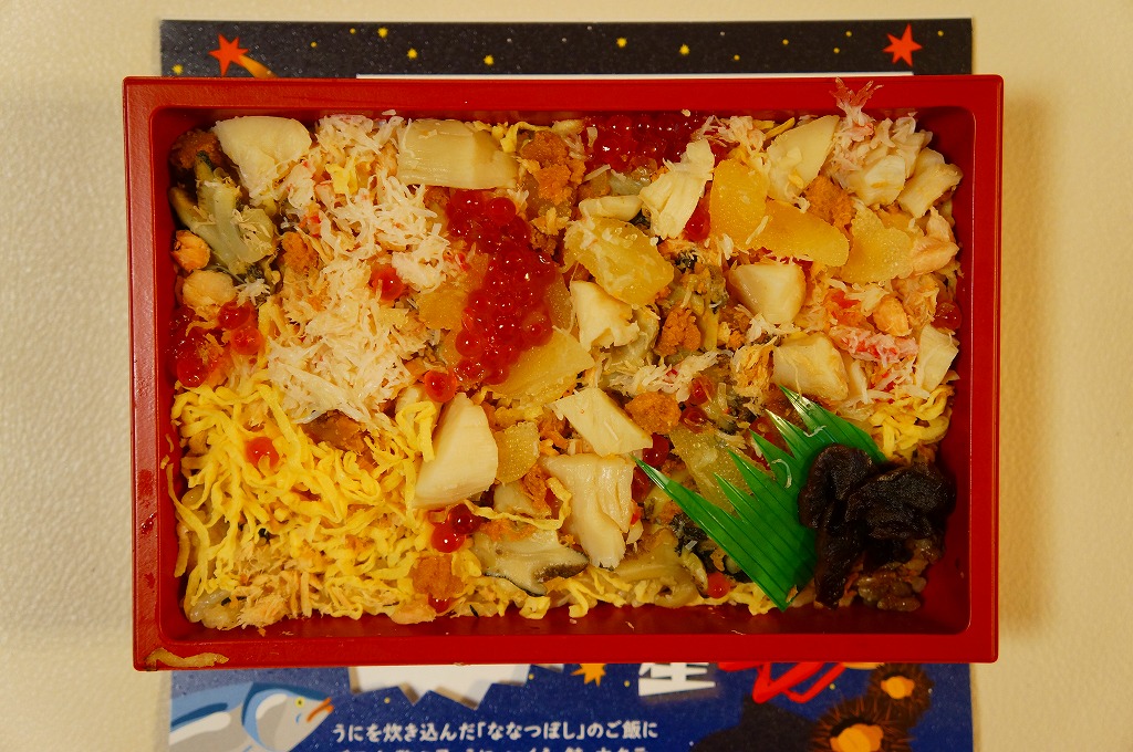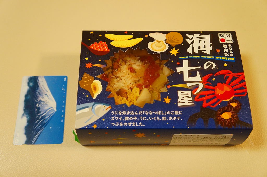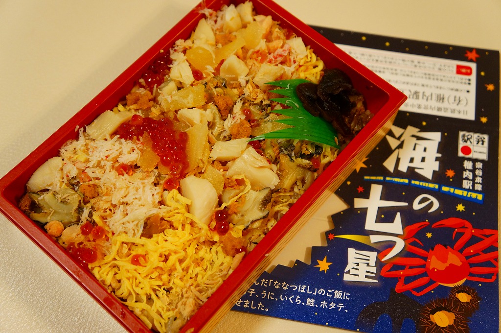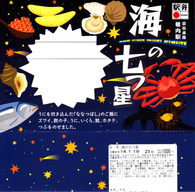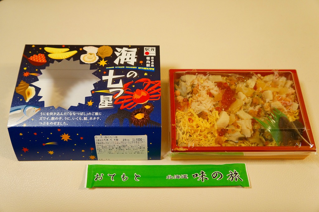 2012(平成24)年9月のイトーヨーカドー各店での駅弁大会でデビューか。北海道米ななつぼしを使うウニの炊込飯を、ズワイガニほぐし身、カズノコ、蒸しウニ、イクラ、鮭、ホタテ貝柱煮、つぶ貝の7種の海産品で覆うから、海の七つ星。ボール紙のパッケージには、それらの具のイラストと北斗七星を描く。これは新しく柔らかい味。価格は2014年の購入時で1,000円、2017年時点で1,080円。2019年までに終売か。