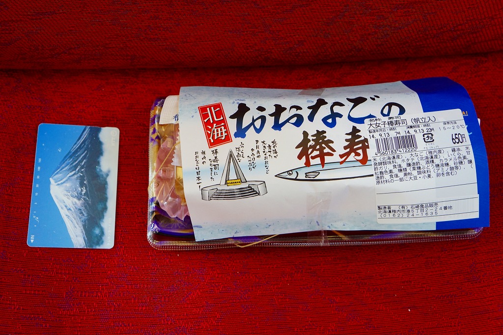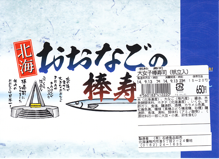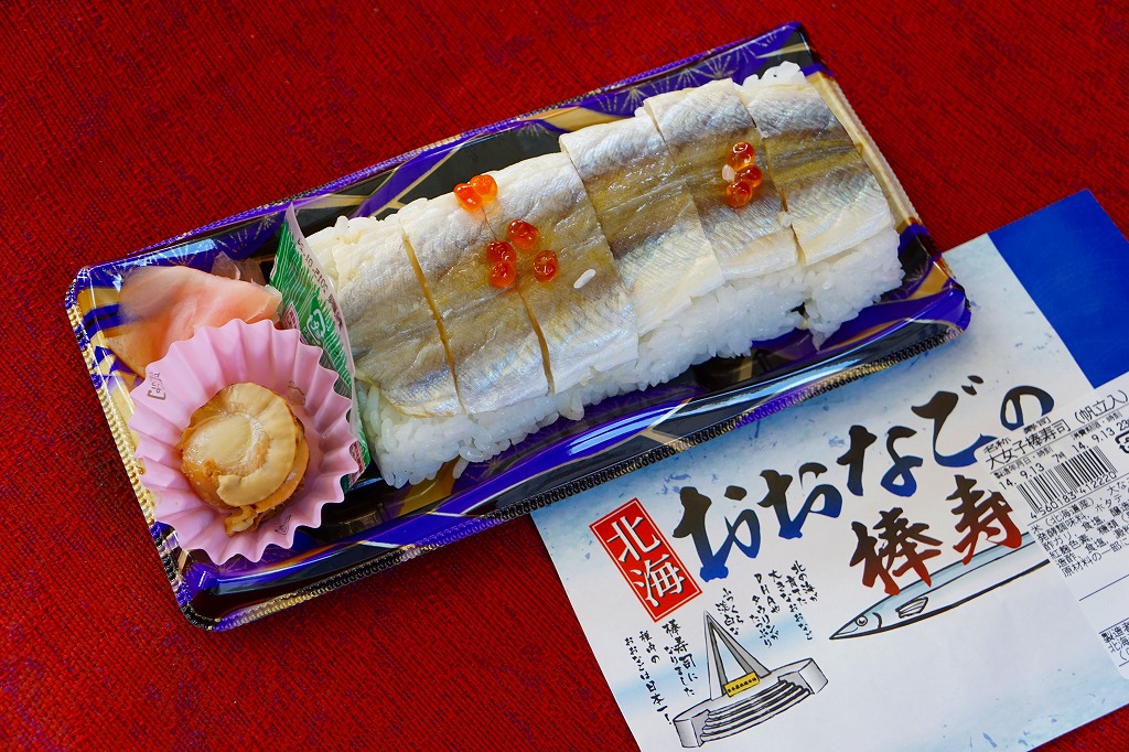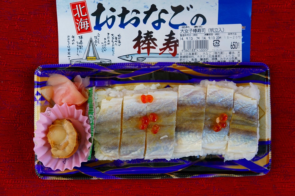 惣菜向け食品トレーに、オオナゴの棒寿司を1本6切れ横たえ、イクラで彩り、ガリとホタテを添え、細い魚と宗谷岬の日本最北端碑を描いた掛紙を巻く。鹿児島のキビナゴを大きくしたような薄く柔らかい身に、軽い酢と風味で、無難な味わい。オオナゴとは、成長したイカナゴに対する北海道内での呼び名。2014年までの販売か。