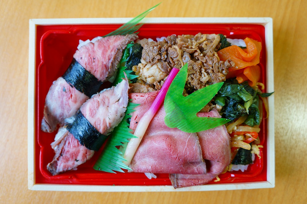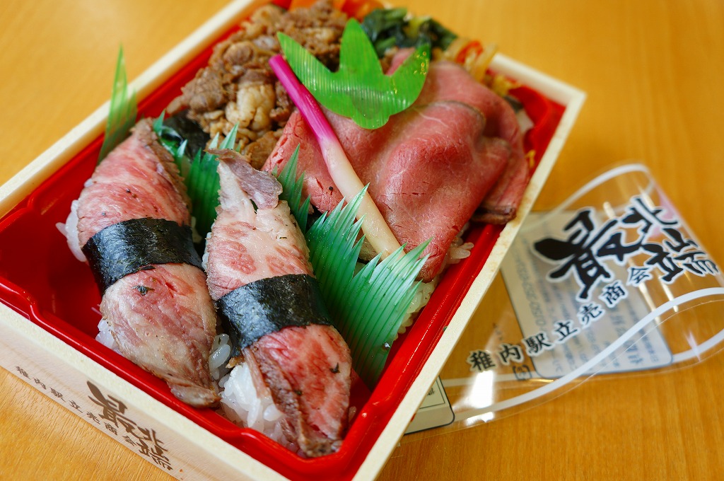 守口京阪の駅弁大会で駅弁を名乗り実演販売されたお弁当。催事向け弁当容器に、ローストビーフの握り寿司2個とローストビーフ丼と牛丼が同居し、きんぴらや漬物などを添える。ここでは稚内駅弁名物がなんとローストビーフ。そんな事実はどこにもない。味が悪いとは思わないが、その存在が悪者である真っ赤な偽駅弁。