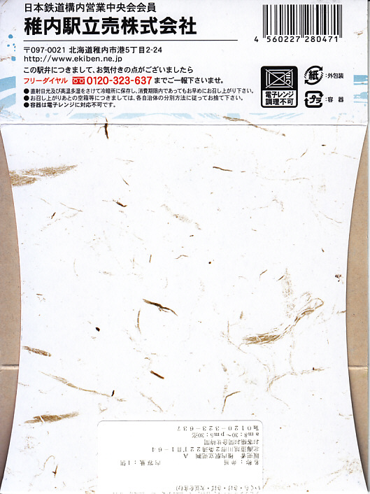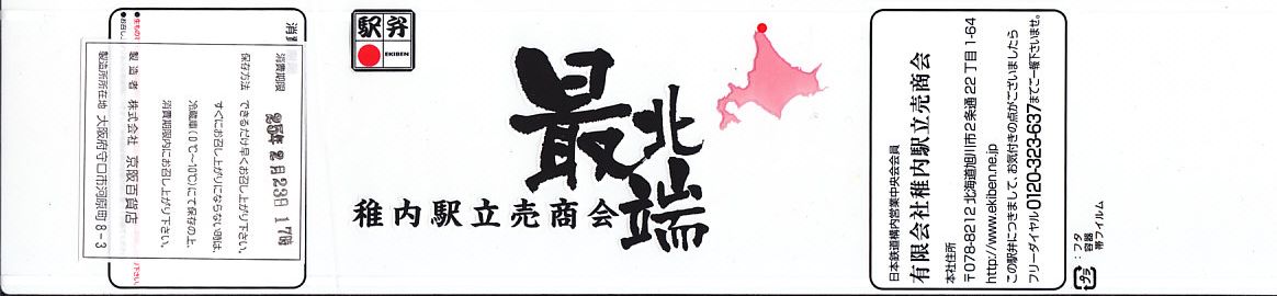 その状況を当館で疑義駅弁と指摘した後の2006年頃から、駅舎内キヨスクでの販売が開始されたようで、その点でむしろ以前より入手は楽になった模様。社名はサンエイ商事から稚内駅立売商会に変わり、この商品での連絡先は旭川駅弁も釧路駅弁も同じ番号のフリーダイヤル。駅前再開発による稚内駅舎の解体の後は、駅の隣の再開発ビルでの販売。